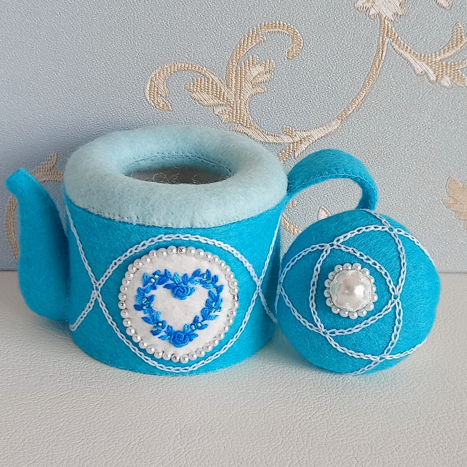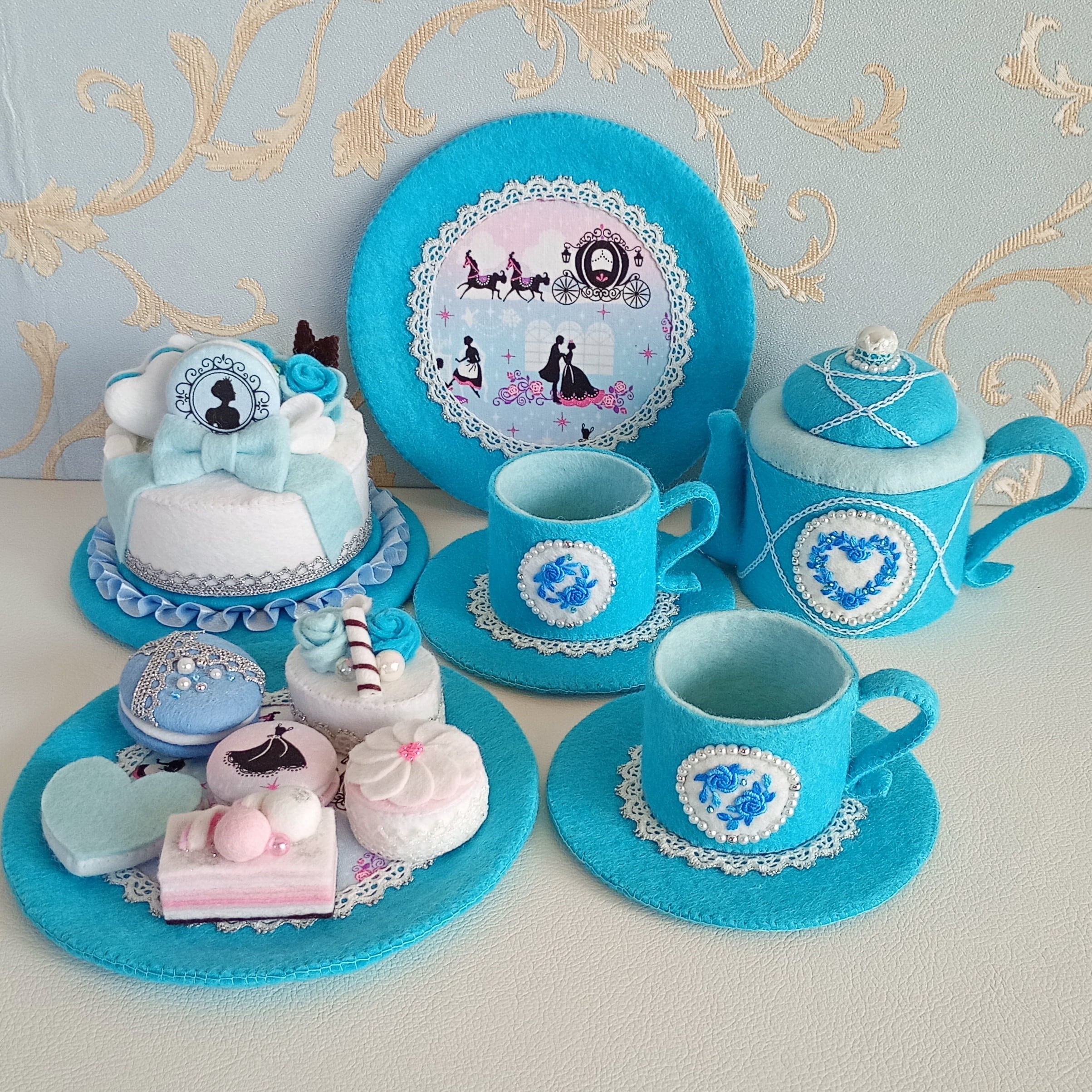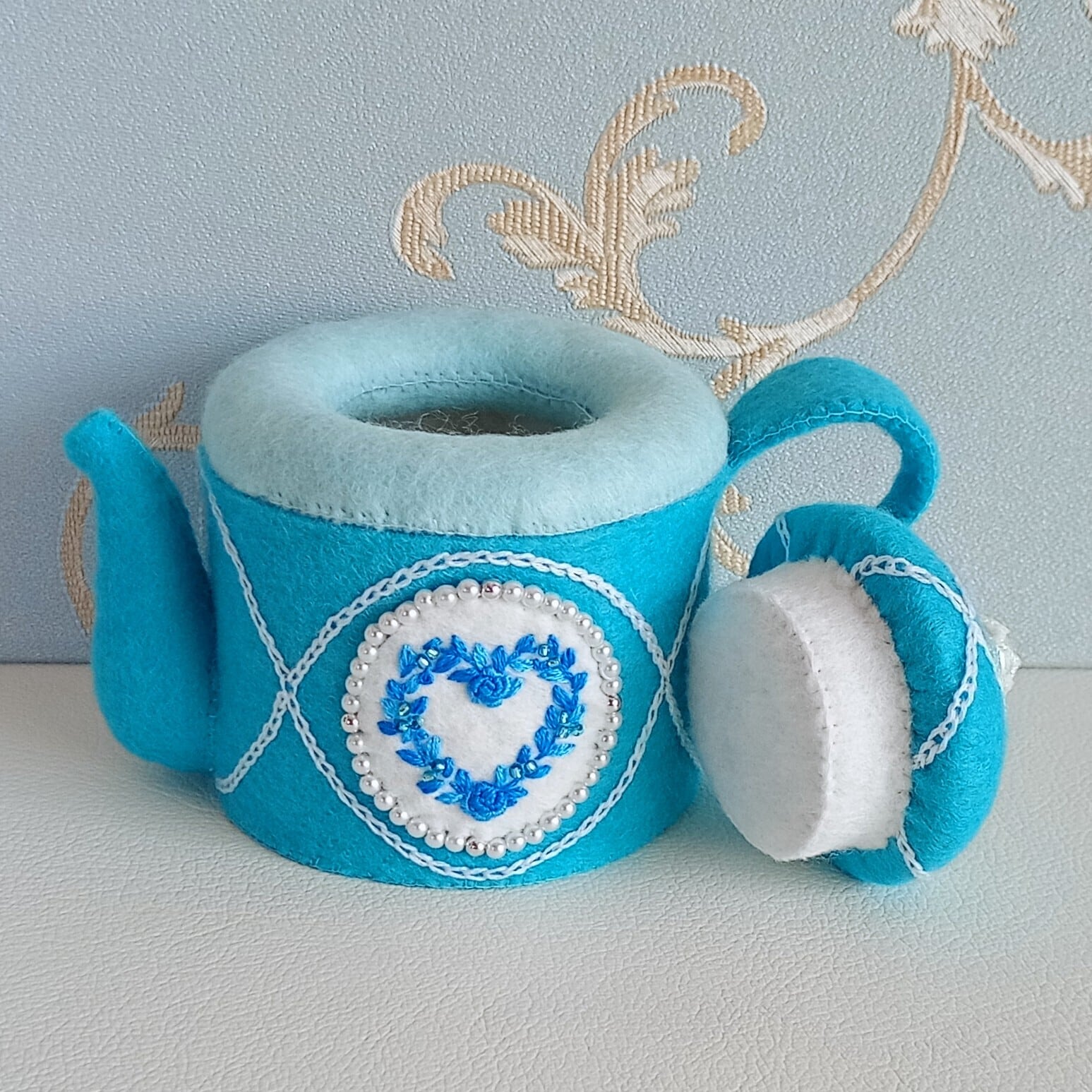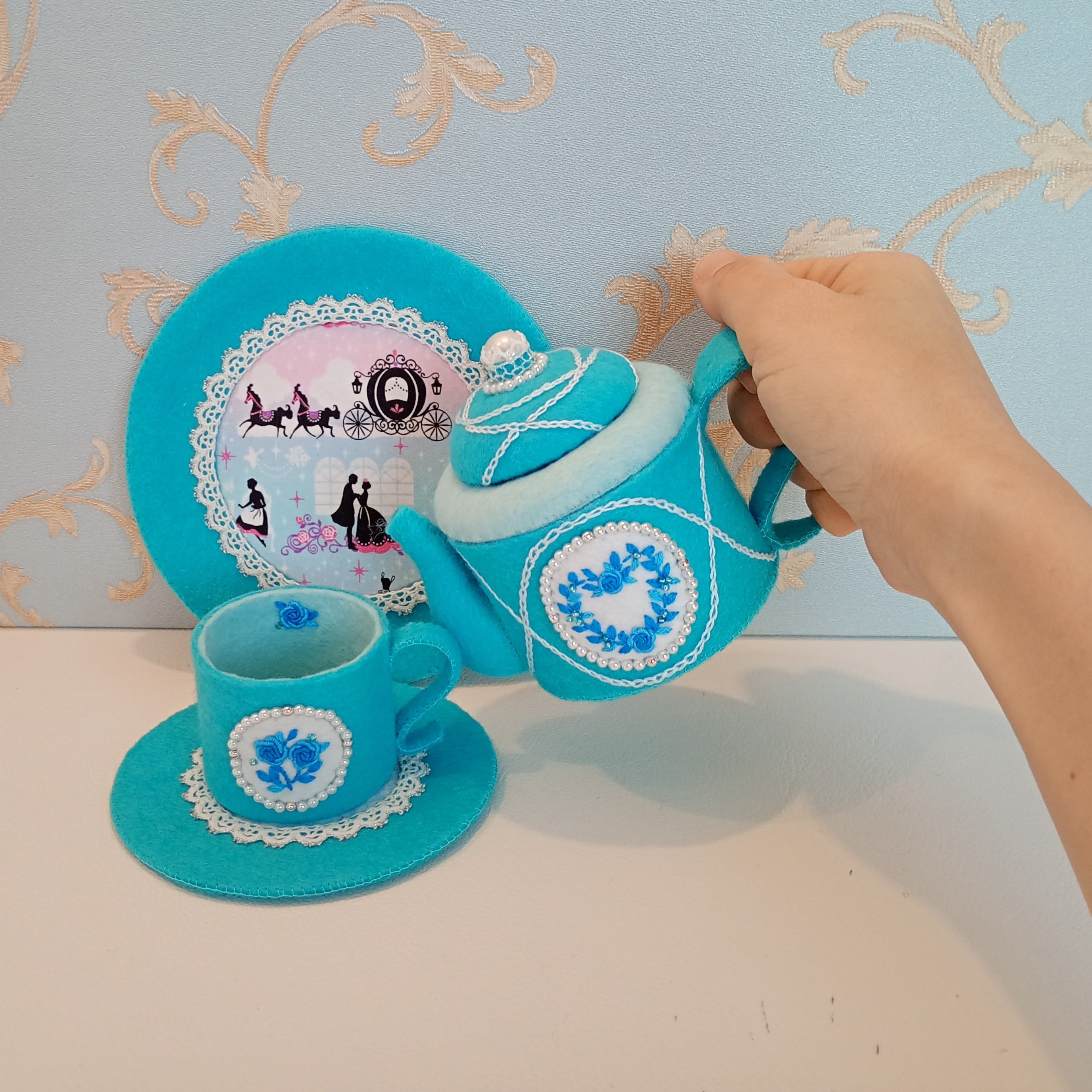 ニュアンスのあるセルリアンブルーのフェルトに刺繍をしたおままごとのティーセットです。プリンセスに憧れる女の子にぴったりの華やかなティーセットで、素敵なティーパーティーはいかがですか?お子さまの遊びが楽しく盛り上がることはもちろん、大人から見ても華やかで楽しめる“絵になるおままごと”です。