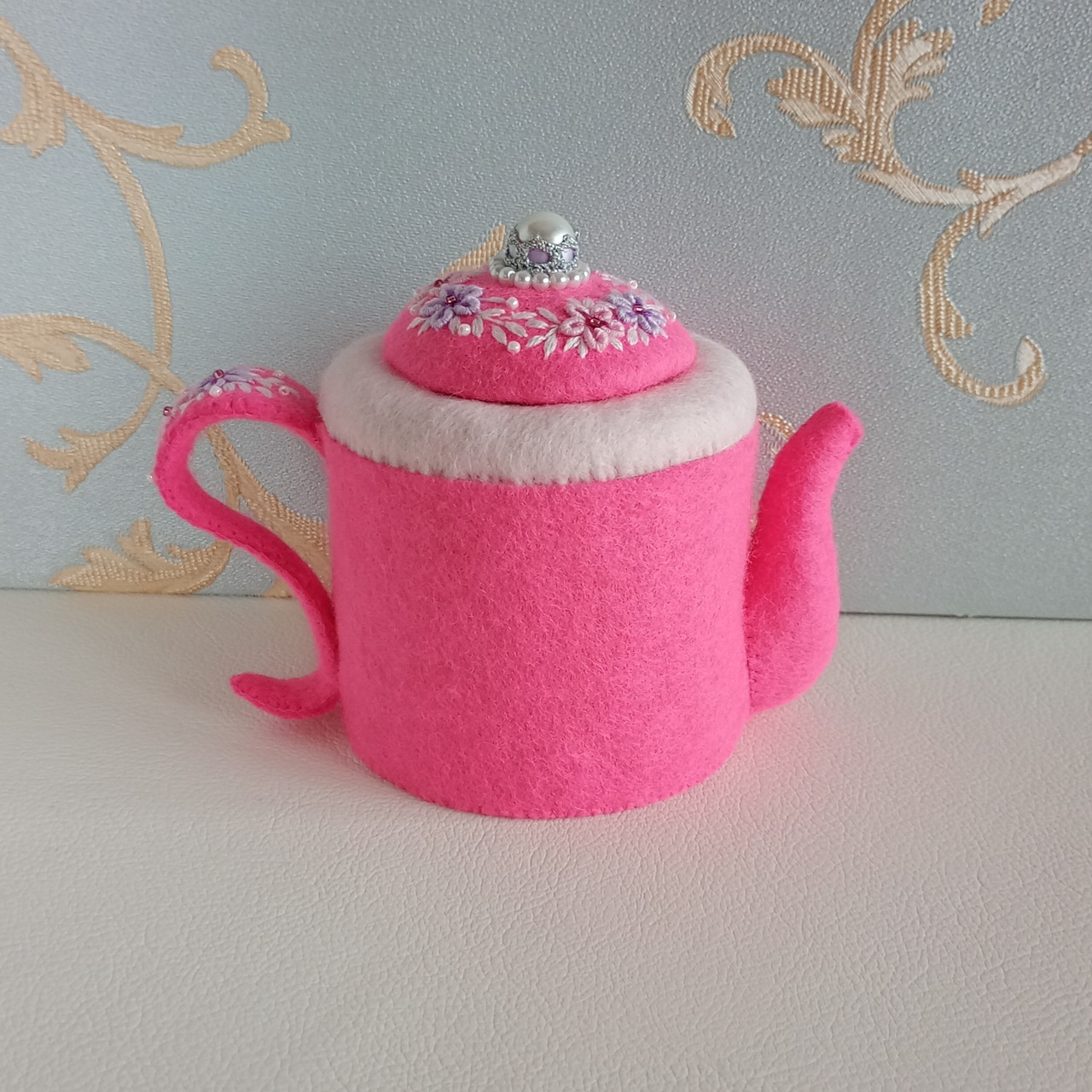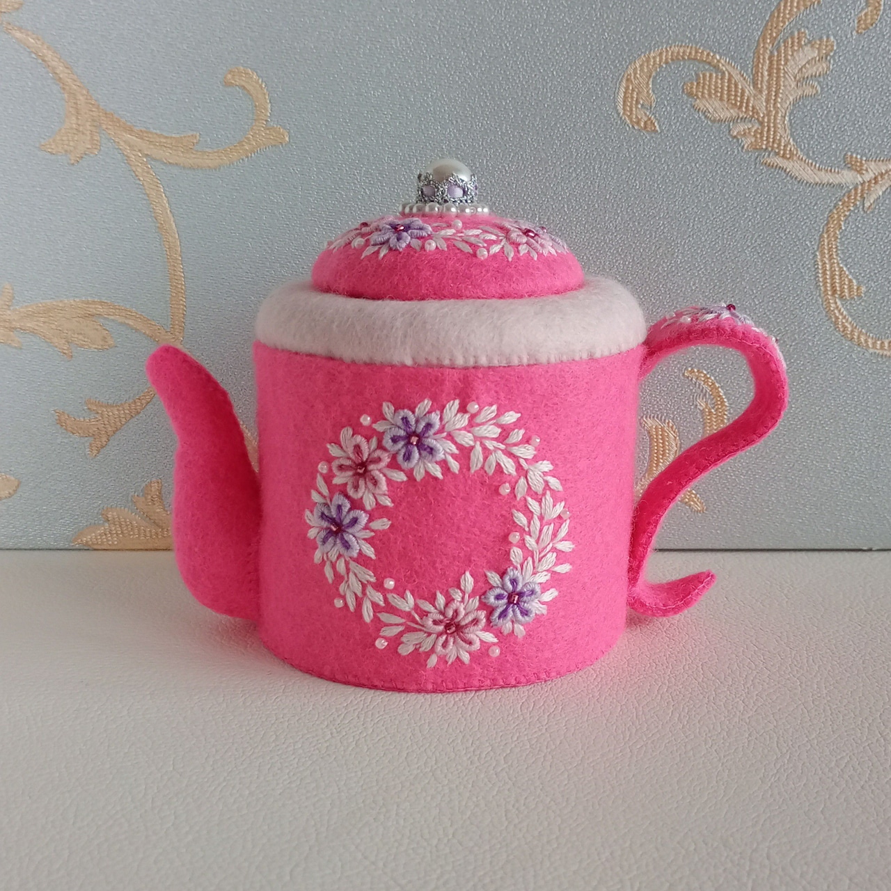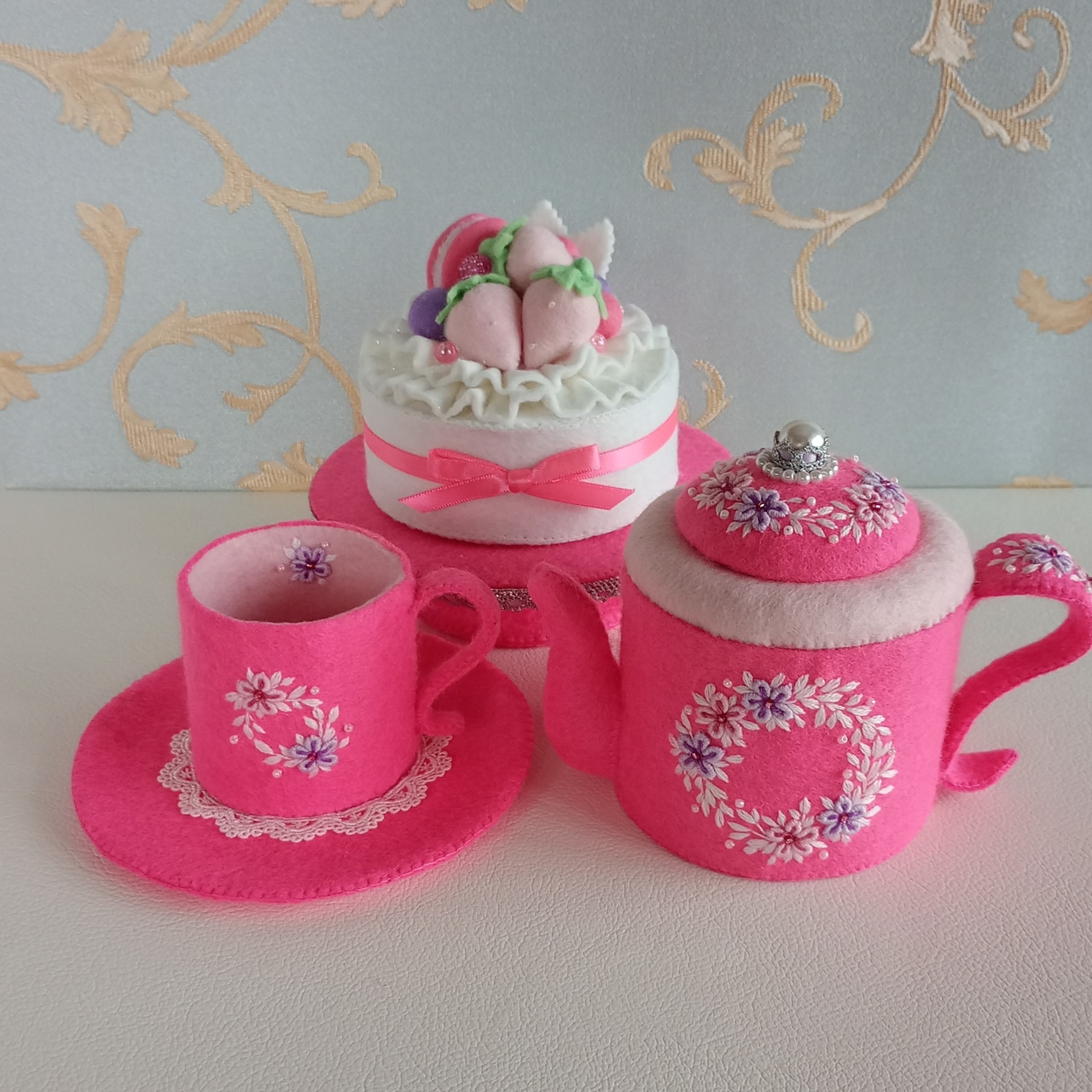 発色のよいピンクのフェルトに刺繍をしたおままごとのティーセットです。薄ピンクと薄紫の花のリースはコントラストが強く目を引く色合いです。ケーキスタンドは足つきですので、ケーキをのせると高さが出て華やかになります。お子さまの遊びが楽しく盛り上がることはもちろん、大人から見ても華やかで楽しめる“絵になるおままごと”です。