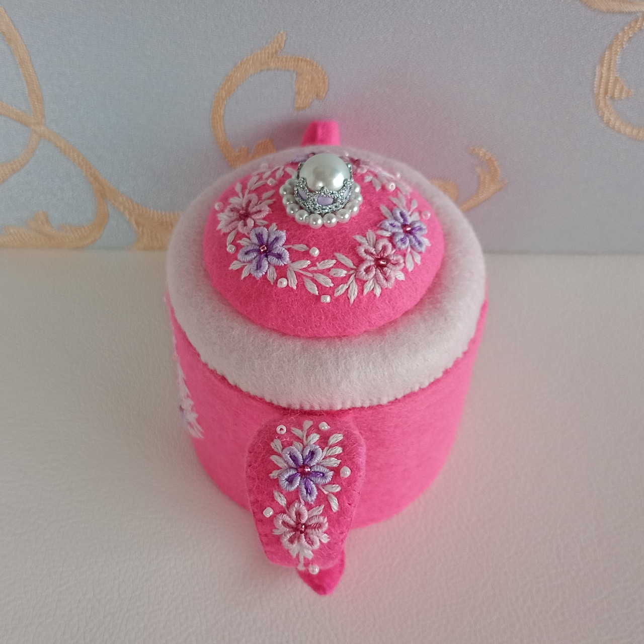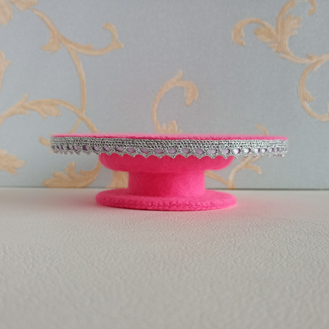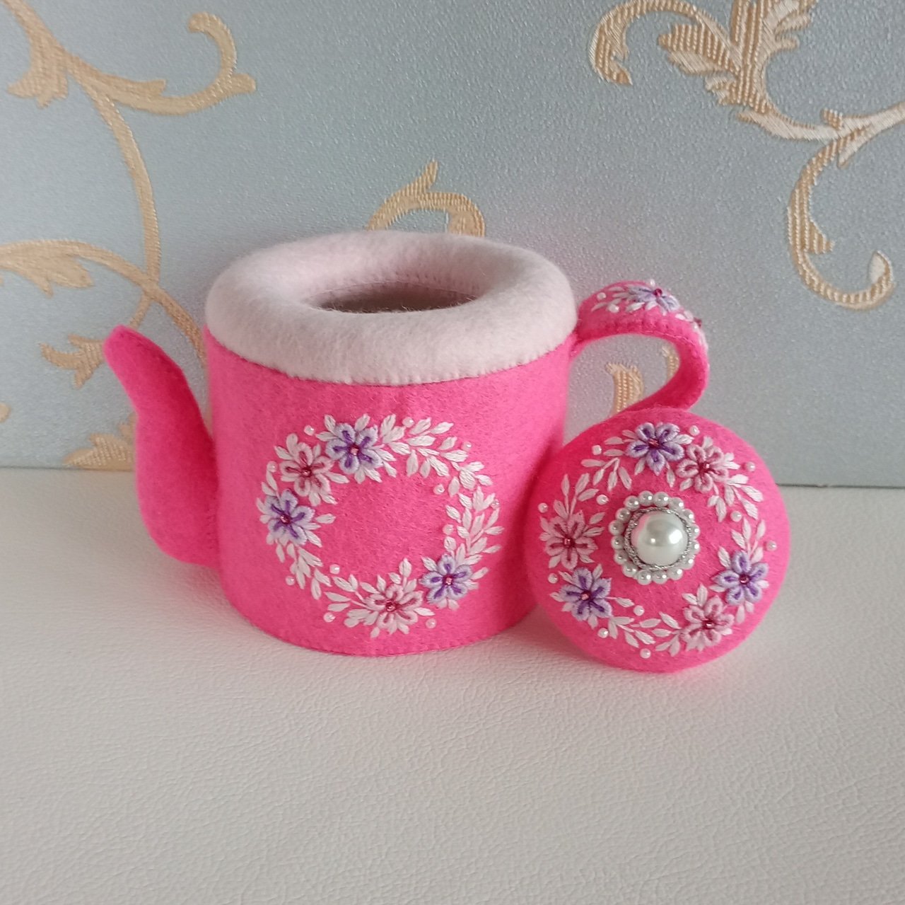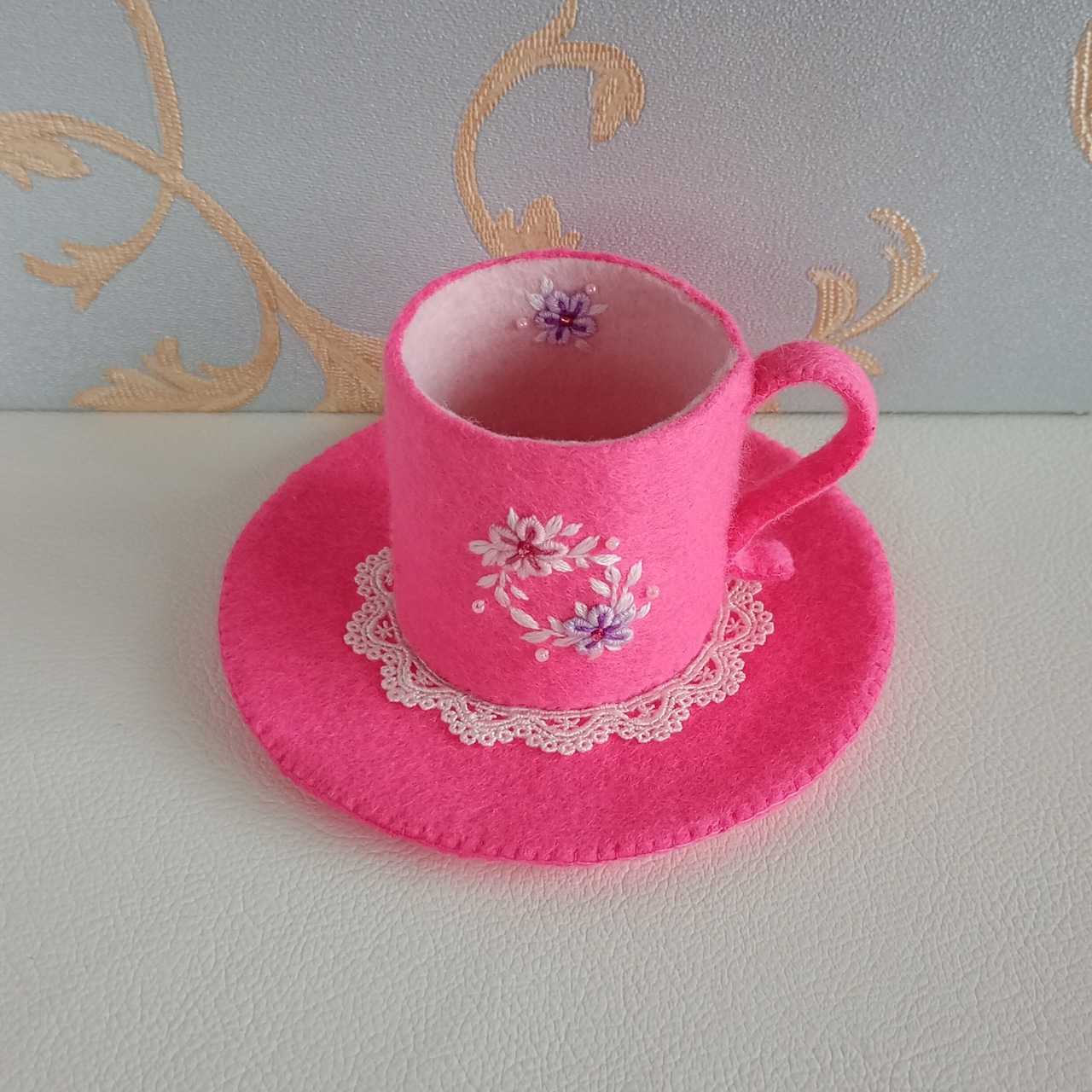発色のよいピンクのフェルトに刺繍をしたおままごとのティーセットです。薄ピンクと薄紫の花のリースはコントラストが強く目を引く色合いです。ケーキスタンドは足つきですので、ケーキをのせると高さが出て華やかになります。お子さまの遊びが楽しく盛り上がることはもちろん、大人から見ても華やかで楽しめる“絵になるおままごと”です。