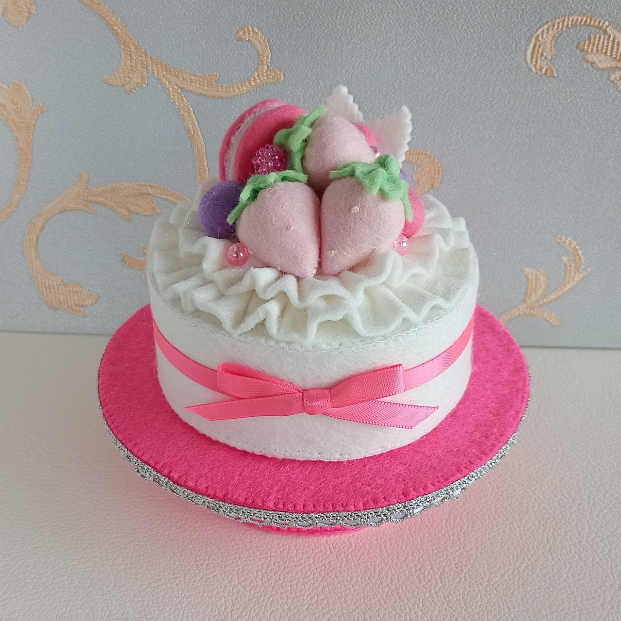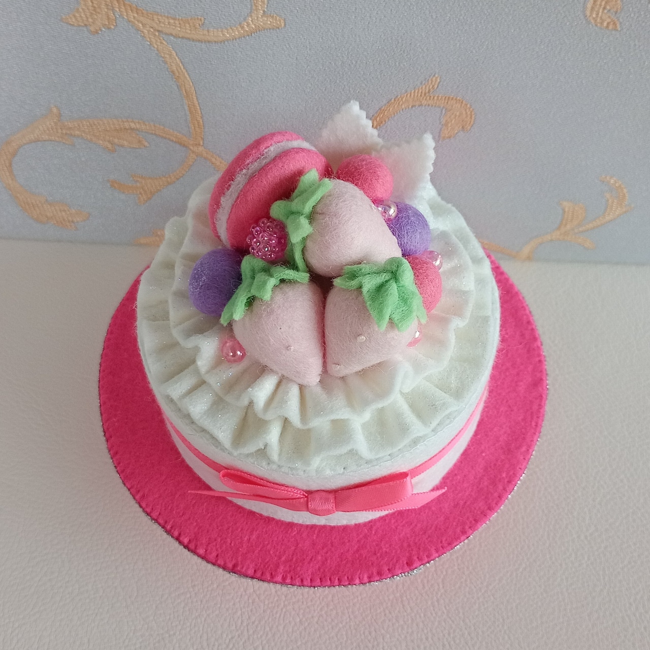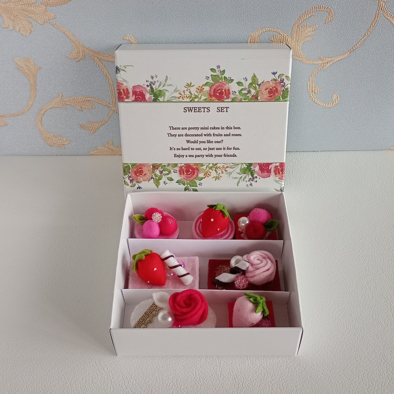 フェルトが廃番色のためケーキ皿がありませんのでお値引きして出品いたします。オプション¥2600で箱入りのミニケーキセットを追加することができます。