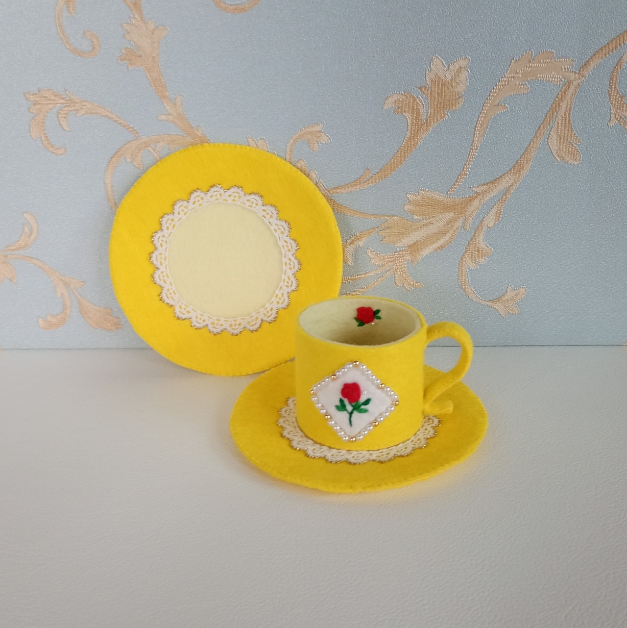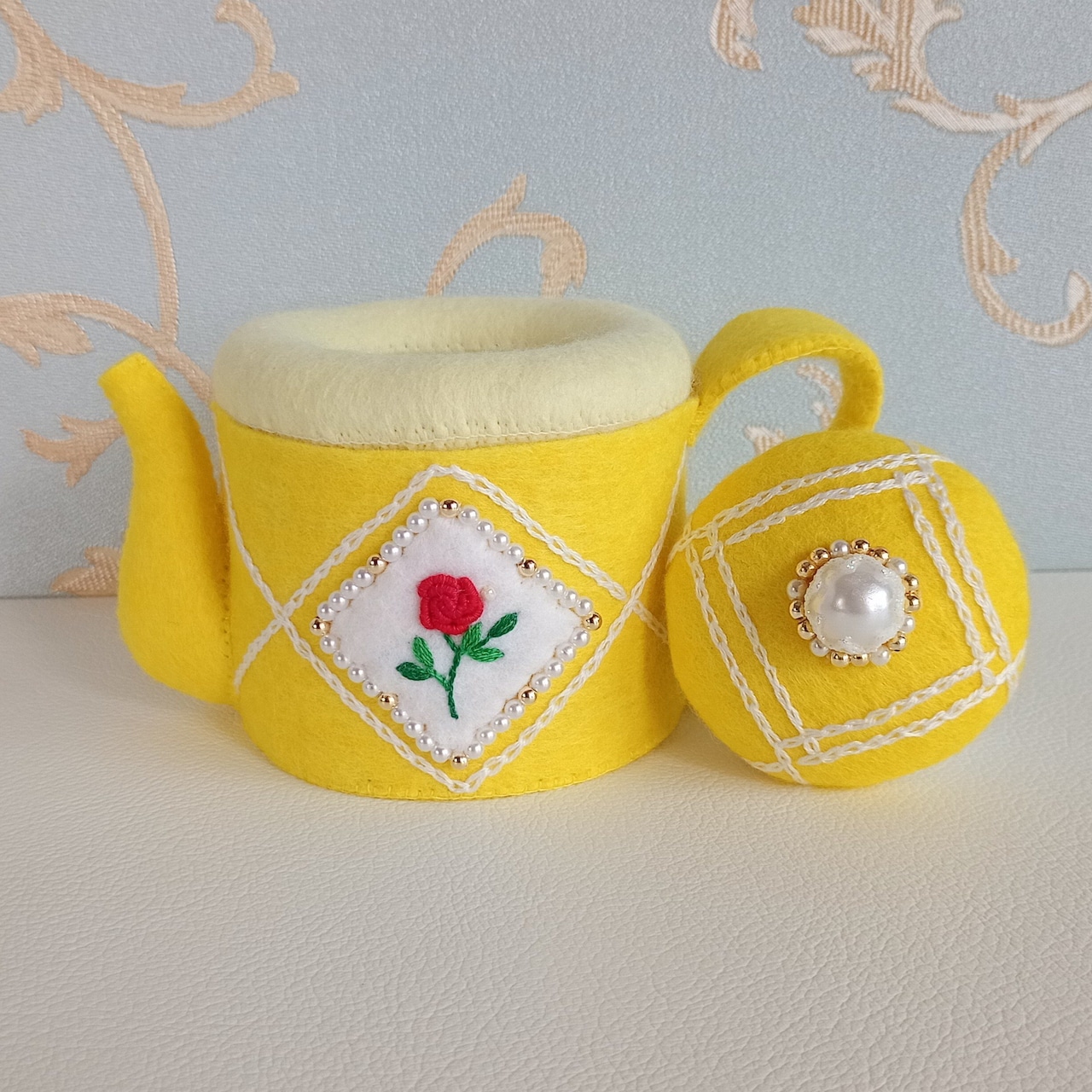 華やかな黄色のフェルトに刺繍をしたおままごとのティーセットです。黄色いドレスを着たプリンセスの物語に出てくる赤いバラを刺繍しました。プリンセスに憧れる女の子にぴったりの華やかなティーセットで、素敵なティーパーティーはいかがですか?お子さまの遊びが楽しく盛り上がることはもちろん、大人から見ても華やかで楽しめる“絵になるおままごと”です。