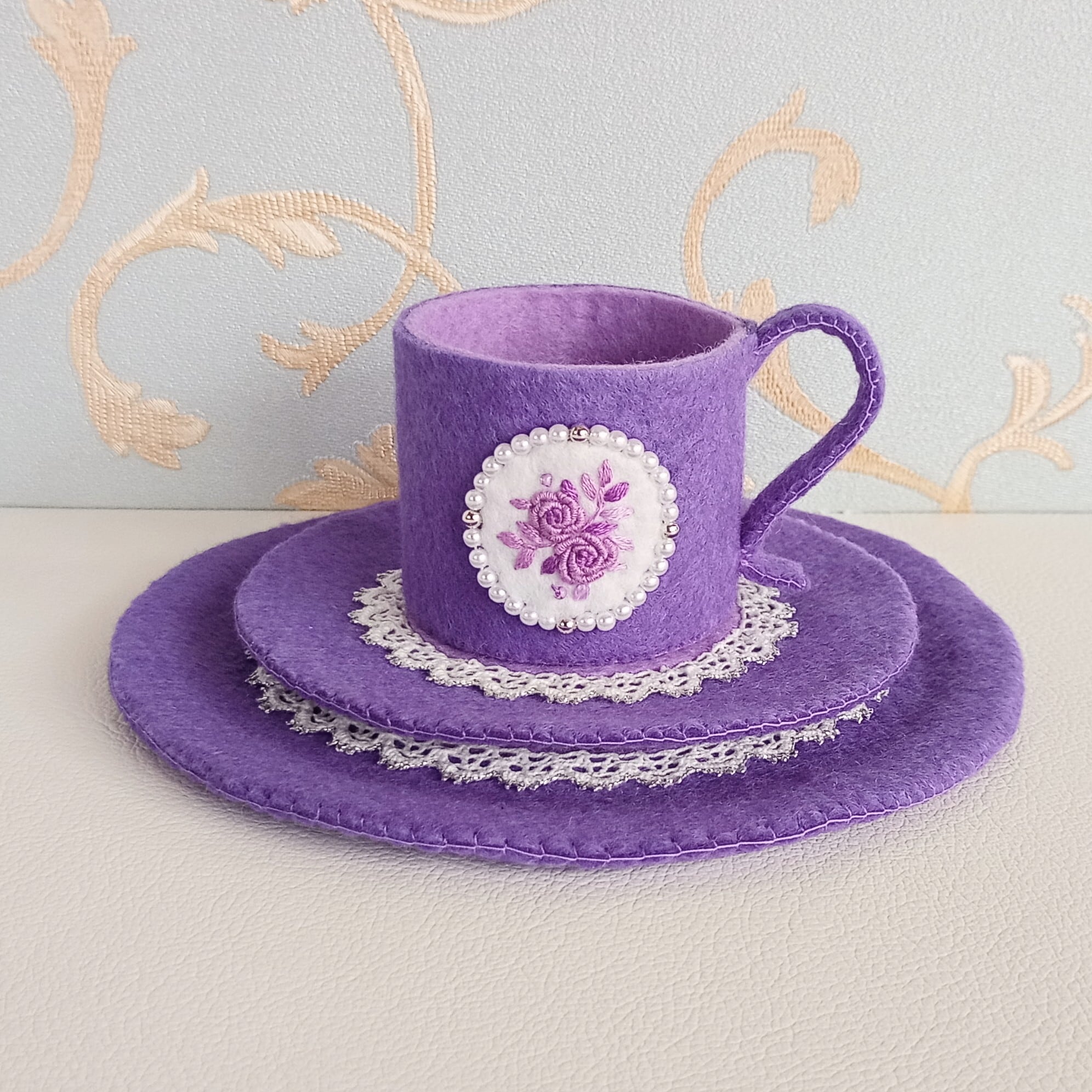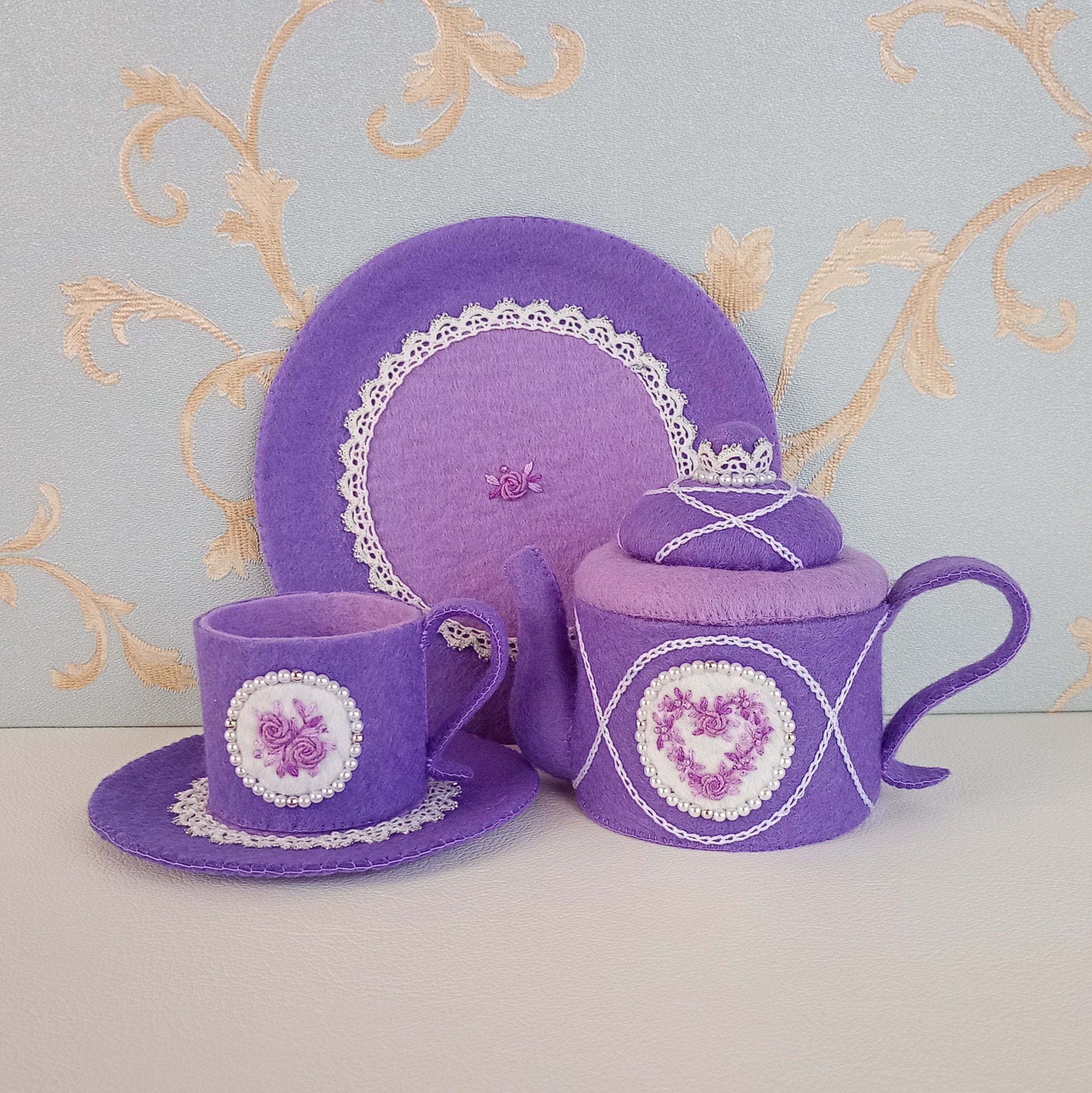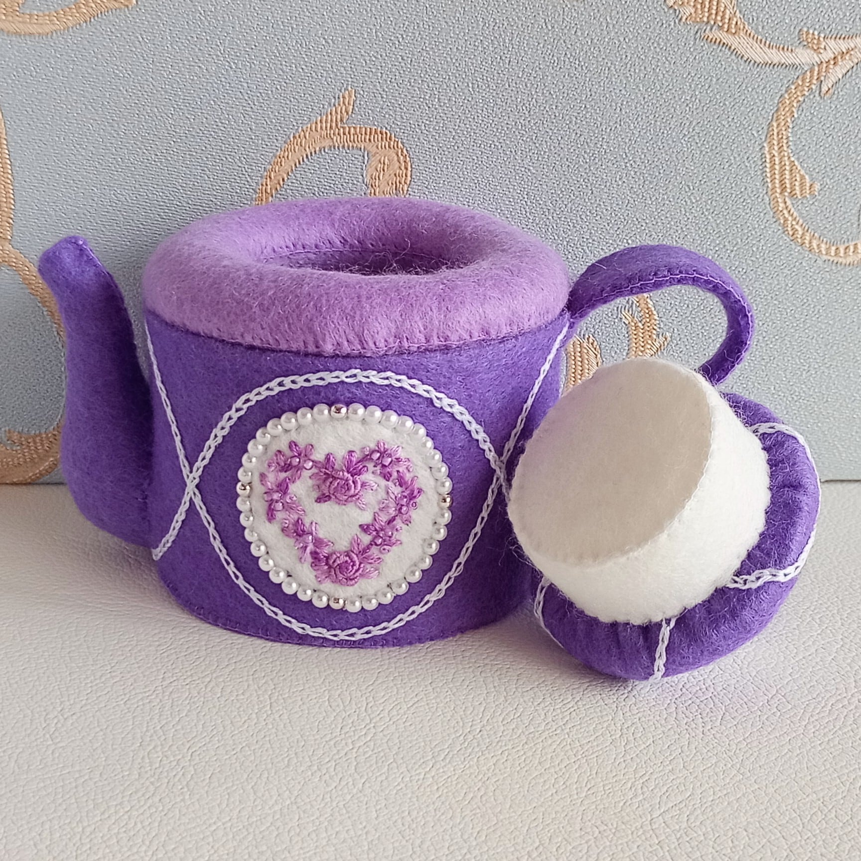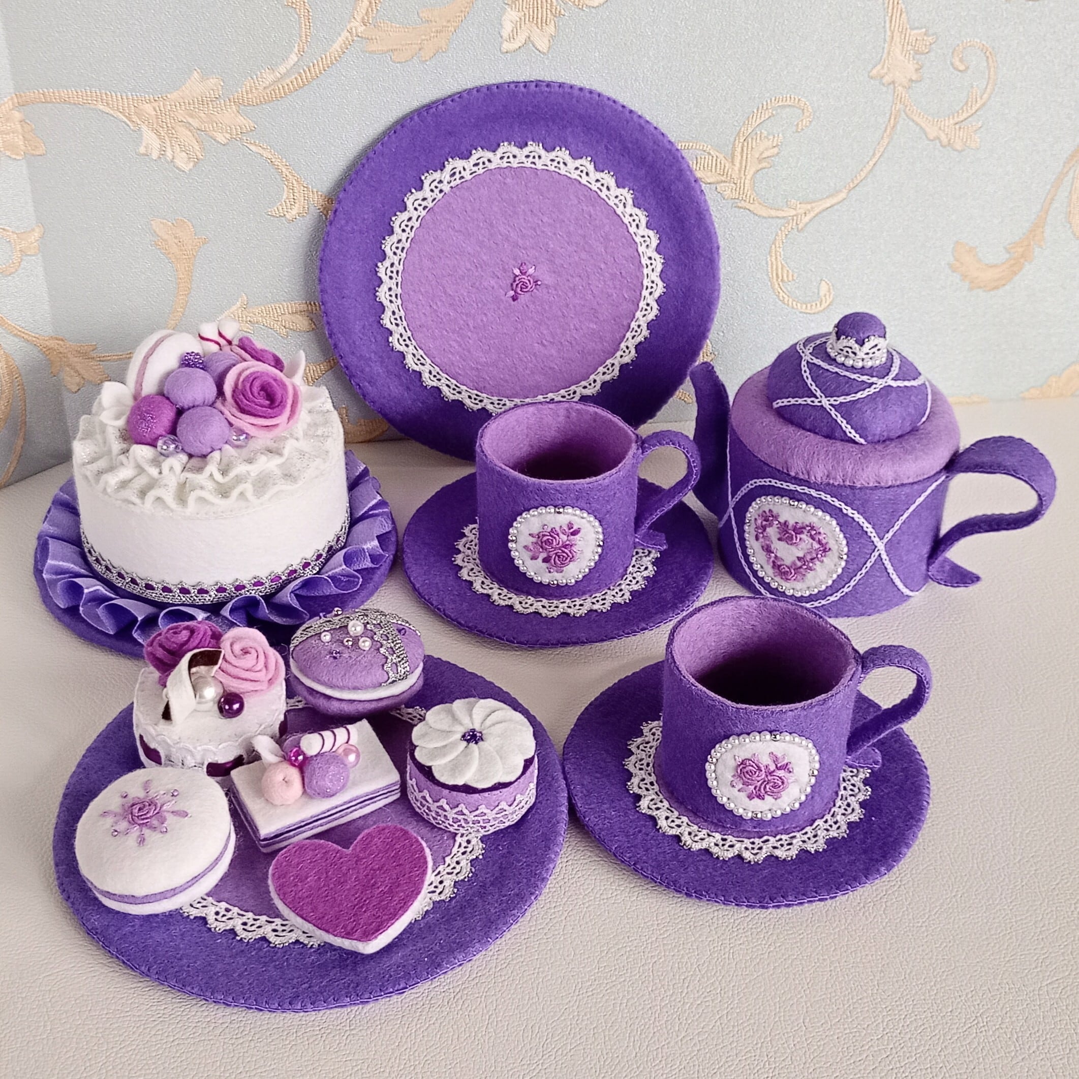 2色の藤色のフェルトに刺繍をしたおままごとのティーセットです。濃淡のある藤色に白の刺繍やレース、パールビーズが映える、紫好きさんに是非お勧めしたいデザインです。お子さまのおままごととしてだけでなく、インテリアとしても楽しめる華やかさです。フェルトと刺繍が作り出す『絵になる優雅なおままごと』を是非お楽しみください。