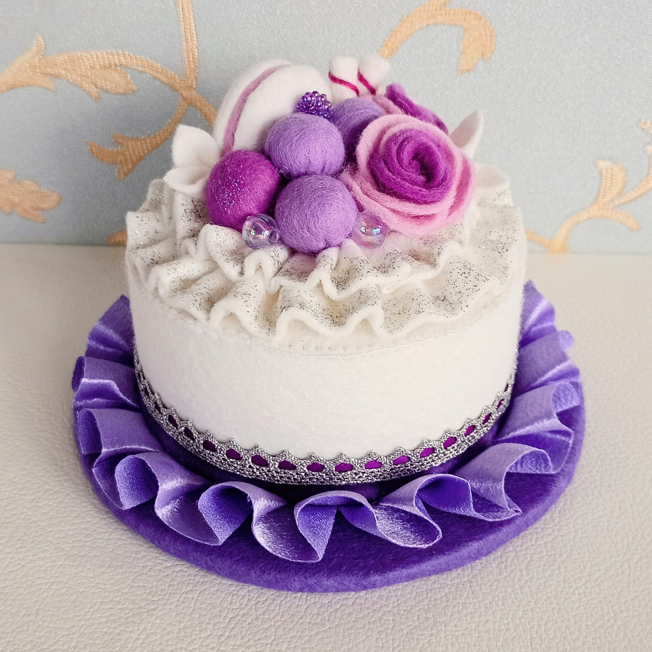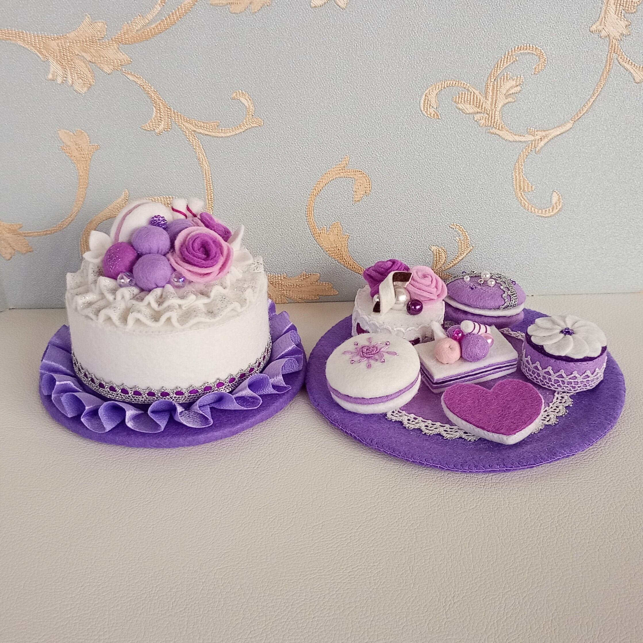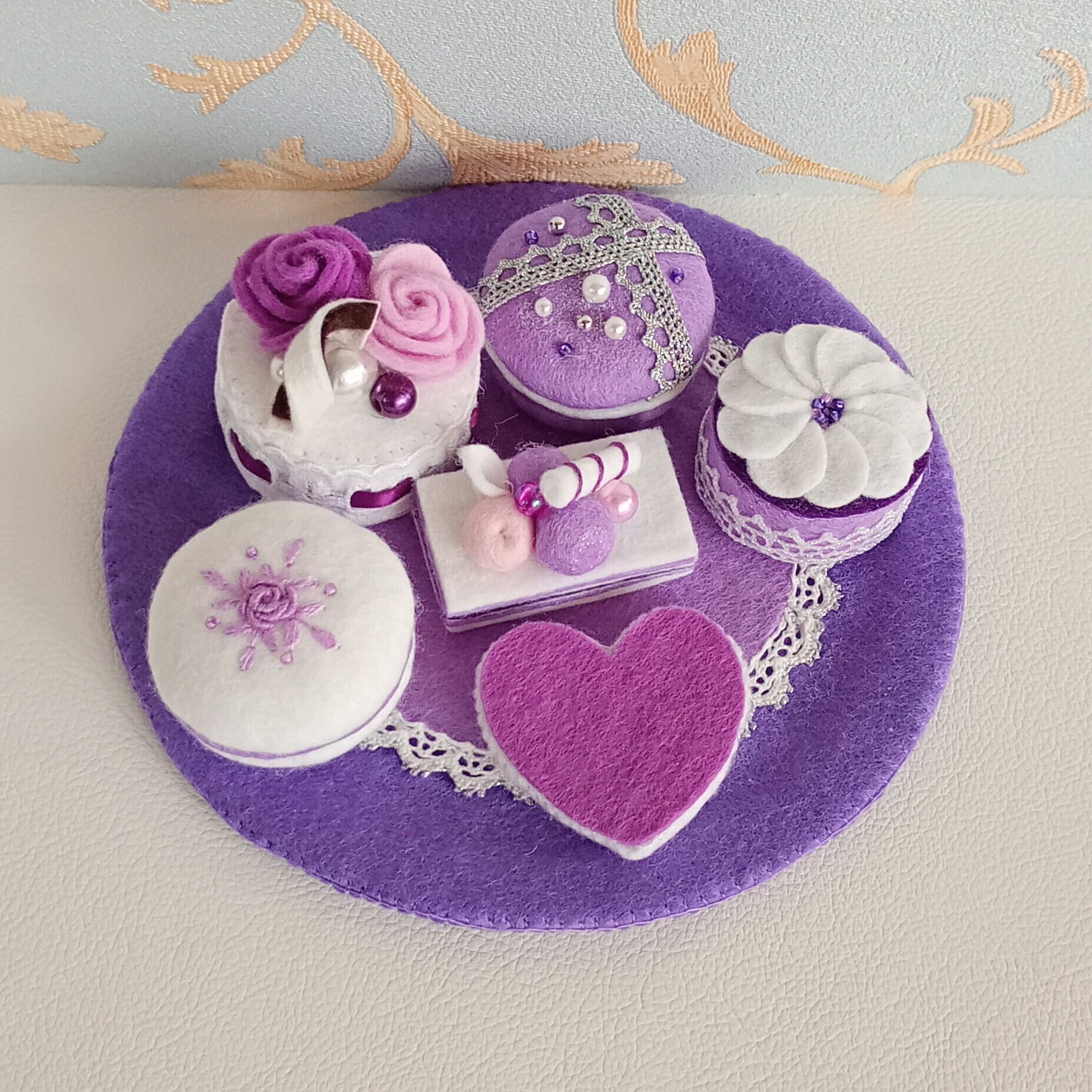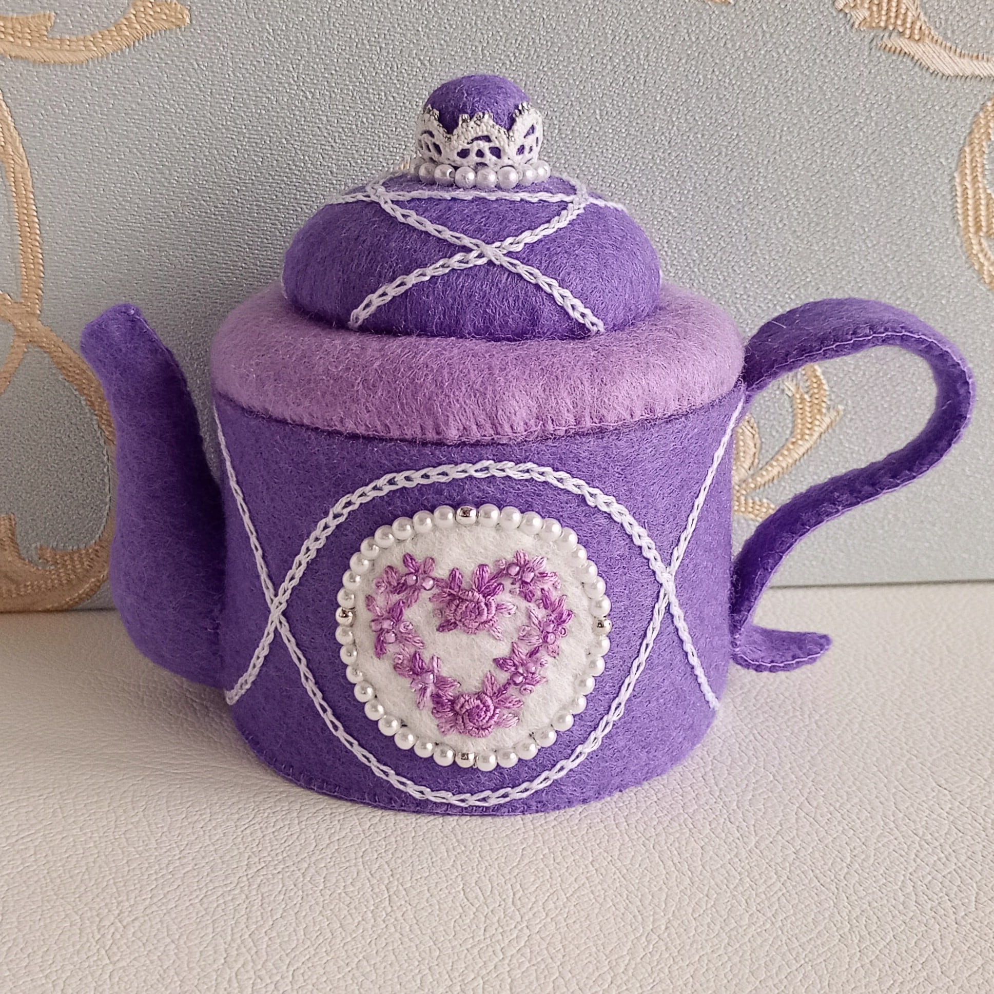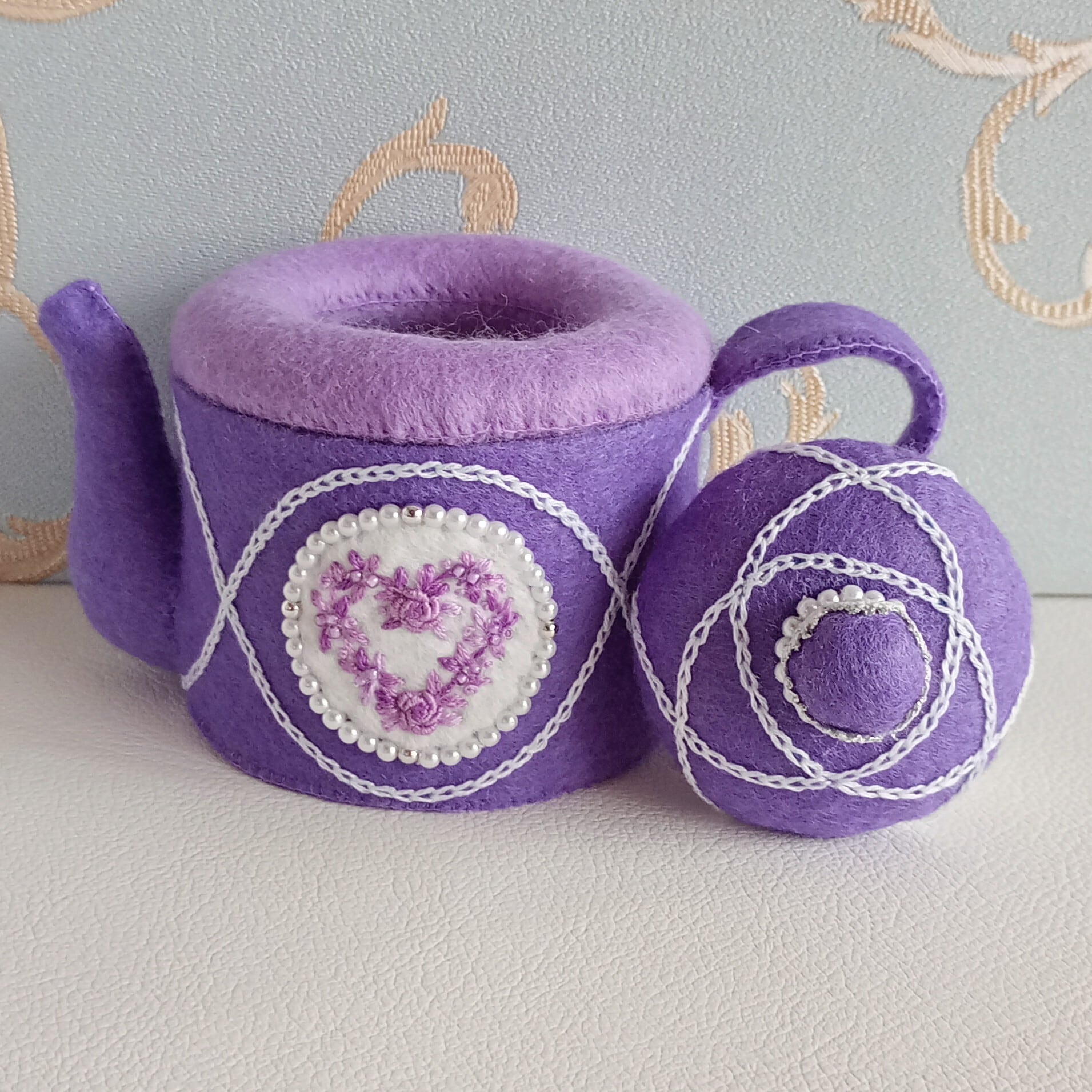 2色の藤色のフェルトに刺繍をしたおままごとのティーセットです。濃淡のある藤色に白の刺繍やレース、パールビーズが映える、紫好きさんに是非お勧めしたいデザインです。お子さまのおままごととしてだけでなく、インテリアとしても楽しめる華やかさです。フェルトと刺繍が作り出す『絵になる優雅なおままごと』を是非お楽しみください。