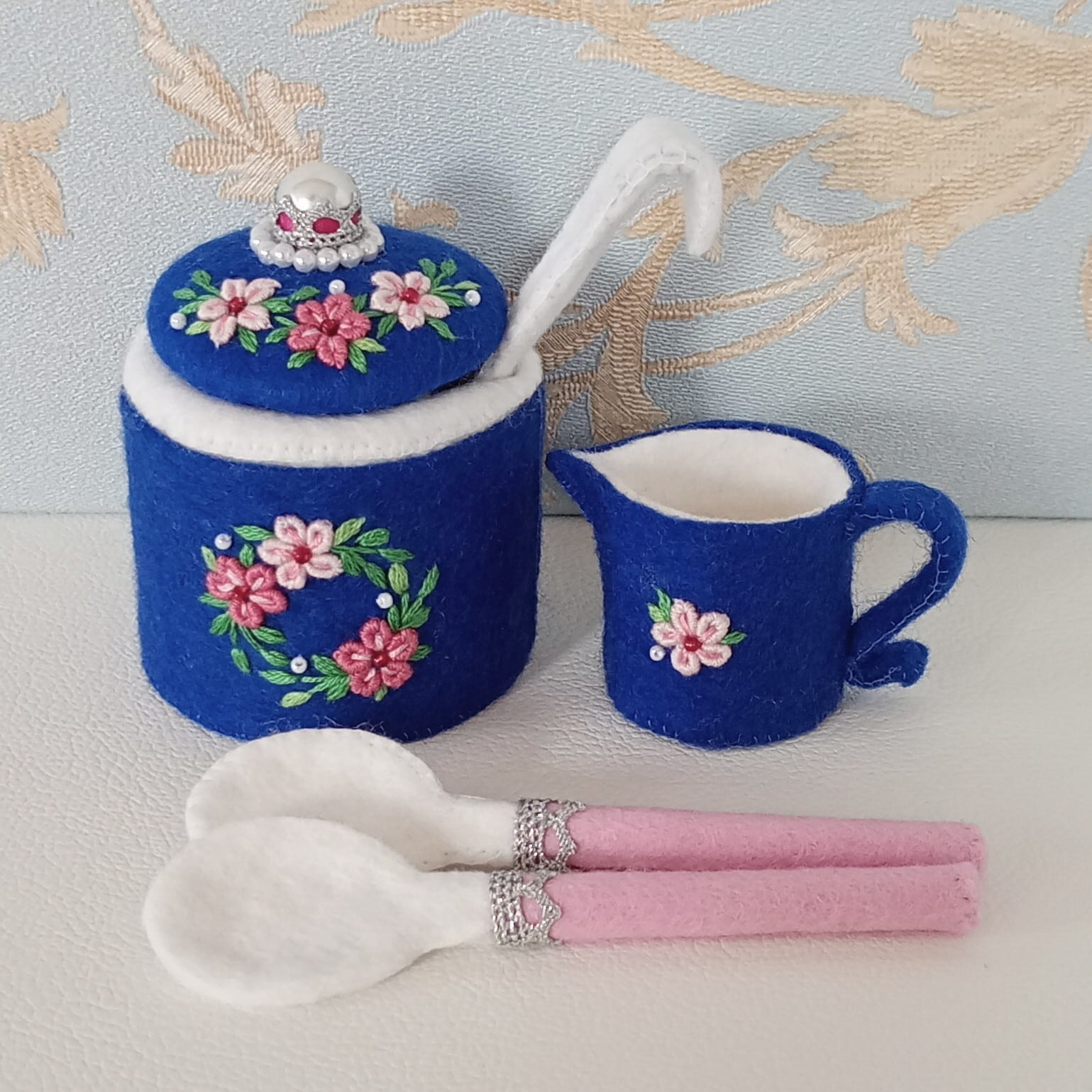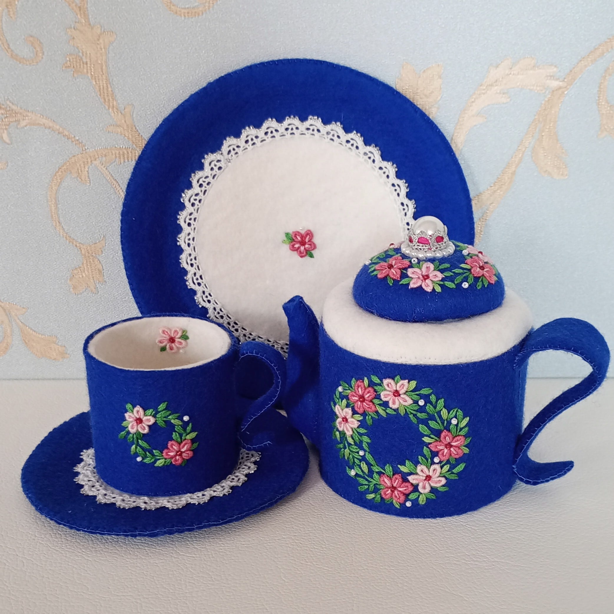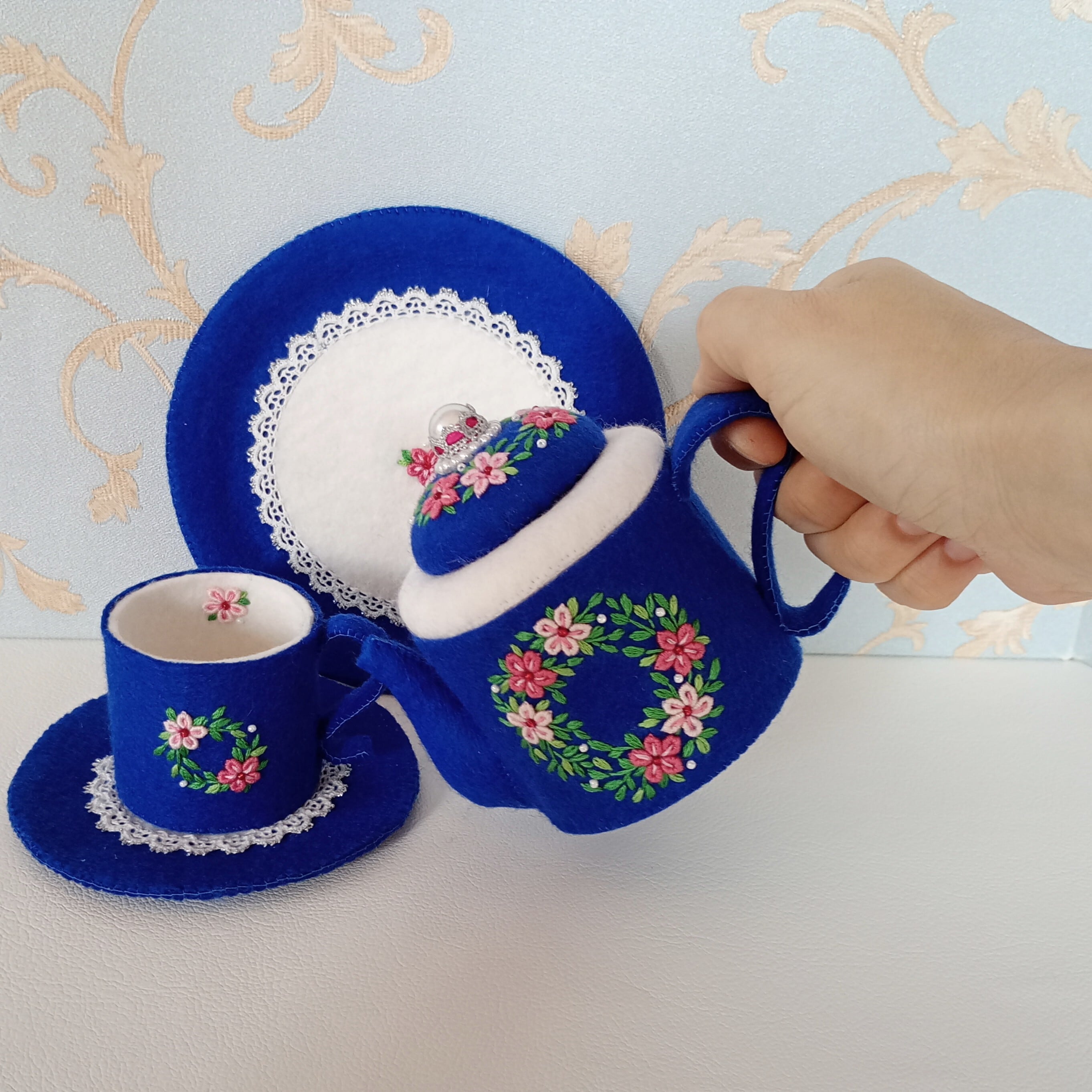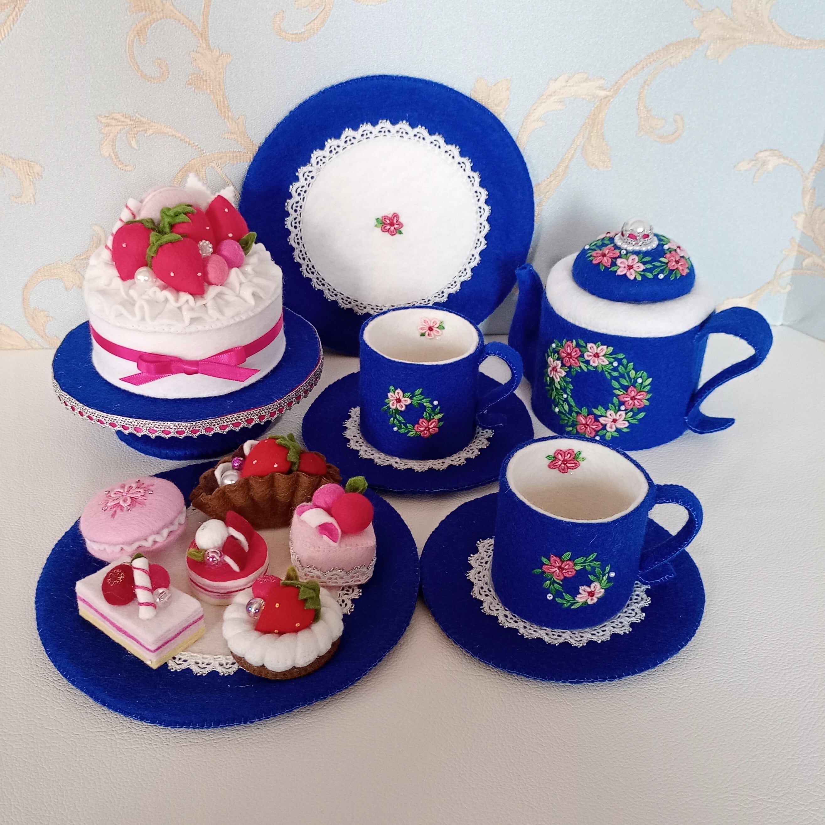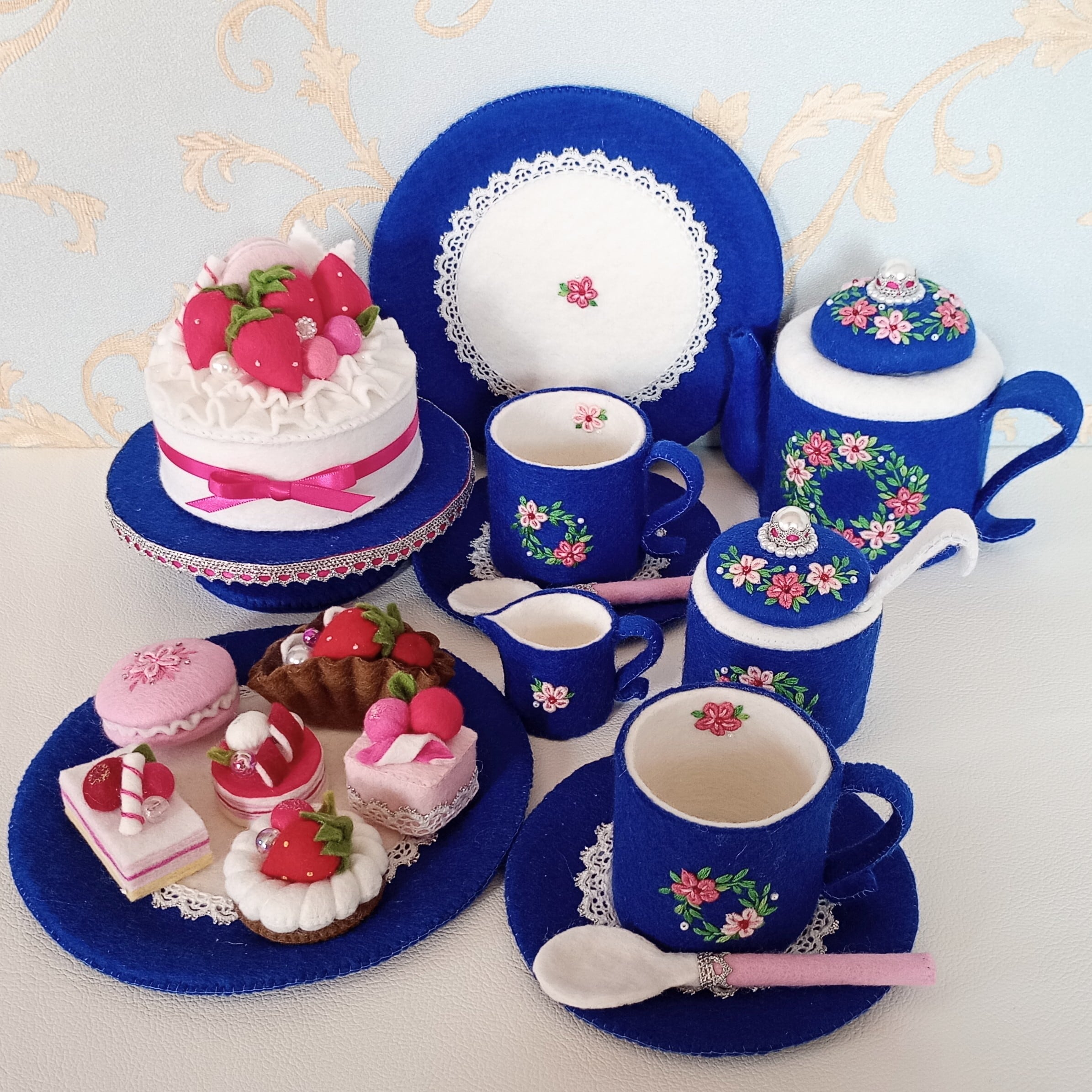 深みのある青いフェルトにピンクの花のリースを刺繍したおままごとのティーセットです。ティーセットが大人っぽい色味なので、ホールケーキと小菓子はピンクをメインに軽やかな雰囲気に仕上げました。甘いピンクよりも大人っぽい青が好き、というお子さまに是非手に取って頂きたいティーセットです。細かな刺繍と美味しそうなお菓子で素敵なティーパーティーはいかがですか?お子さまの遊びが楽しく盛り上がることはもちろん、大人から見ても華やかで楽しめる“絵になるおままごと”です。