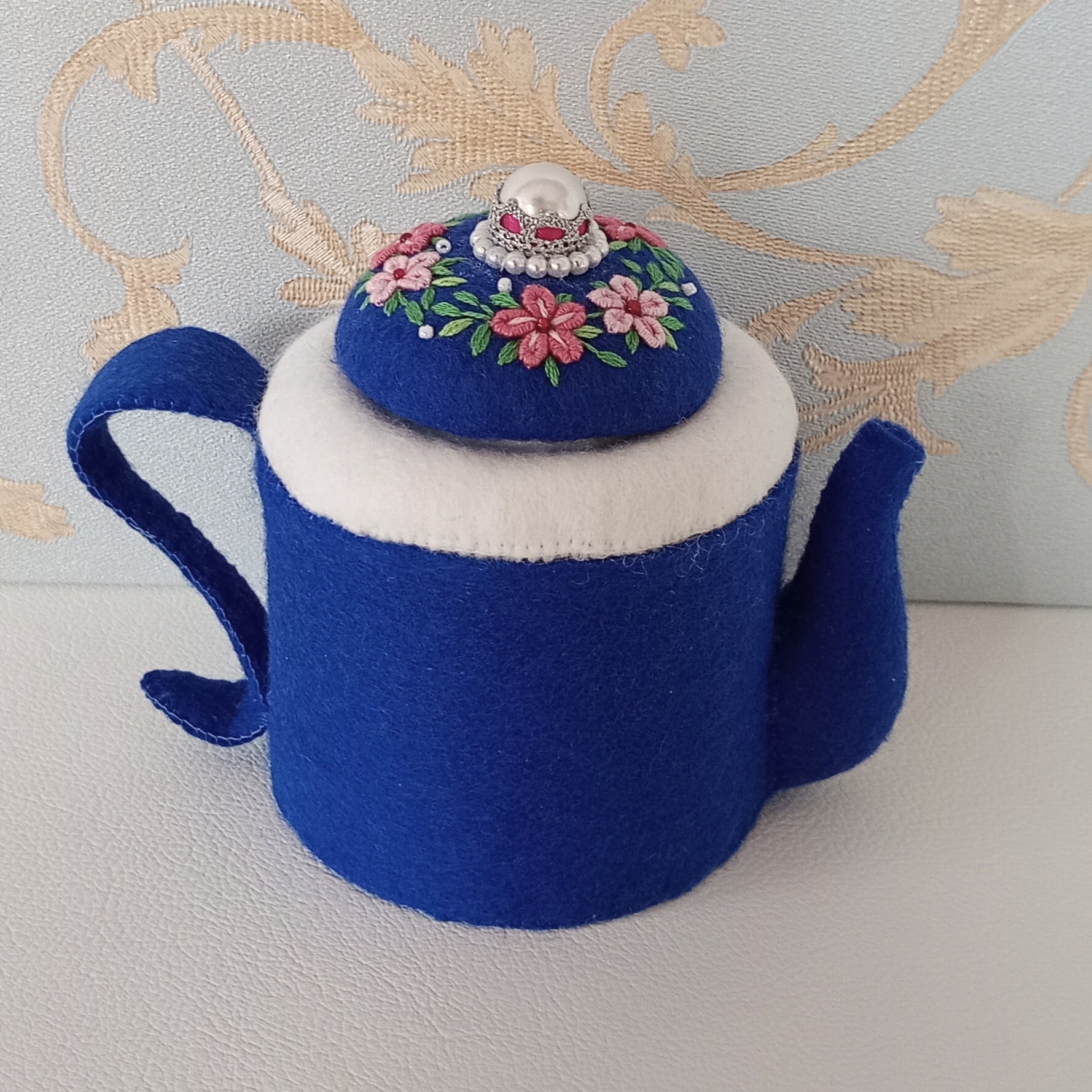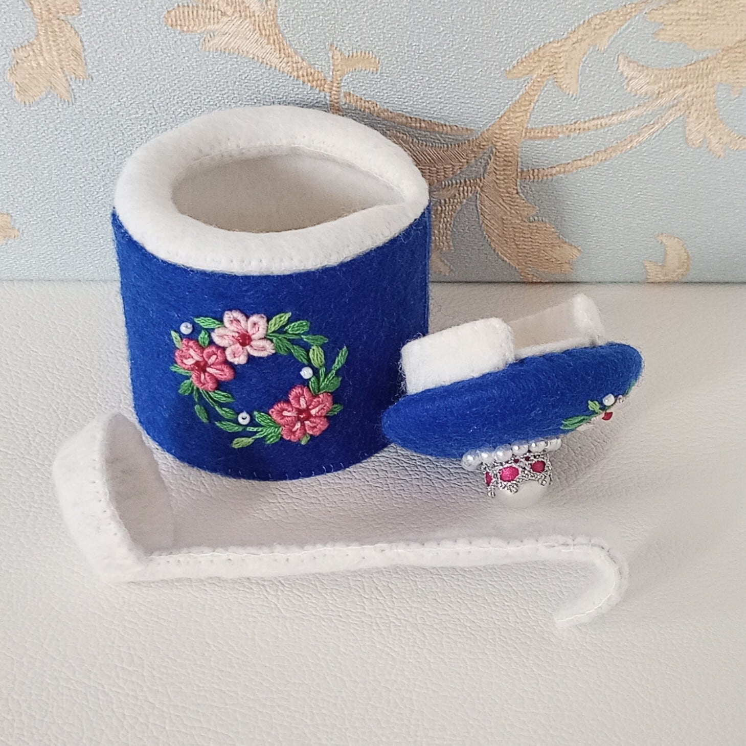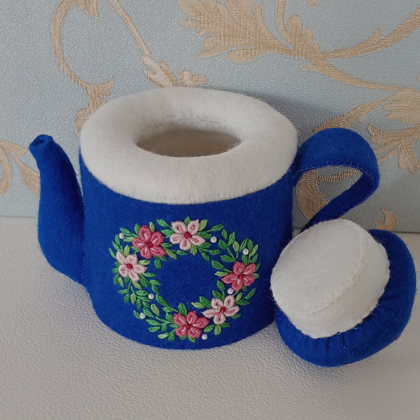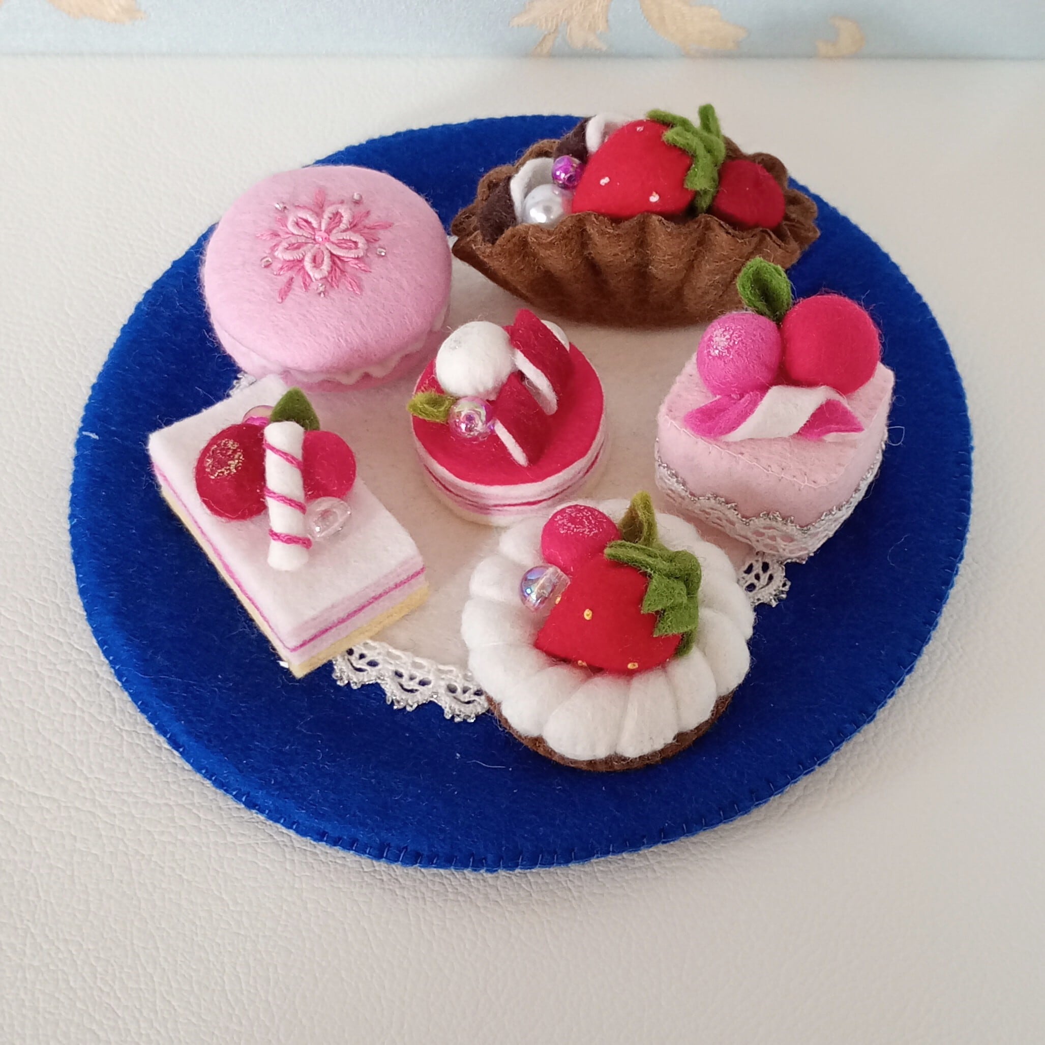 深みのある青いフェルトにピンクの花のリースを刺繍したおままごとのティーセットです。ティーセットが大人っぽい色味なので、ホールケーキと小菓子はピンクをメインに軽やかな雰囲気に仕上げました。甘いピンクよりも大人っぽい青が好き、というお子さまに是非手に取って頂きたいティーセットです。細かな刺繍と美味しそうなお菓子で素敵なティーパーティーはいかがですか?お子さまの遊びが楽しく盛り上がることはもちろん、大人から見ても華やかで楽しめる“絵になるおままごと”です。