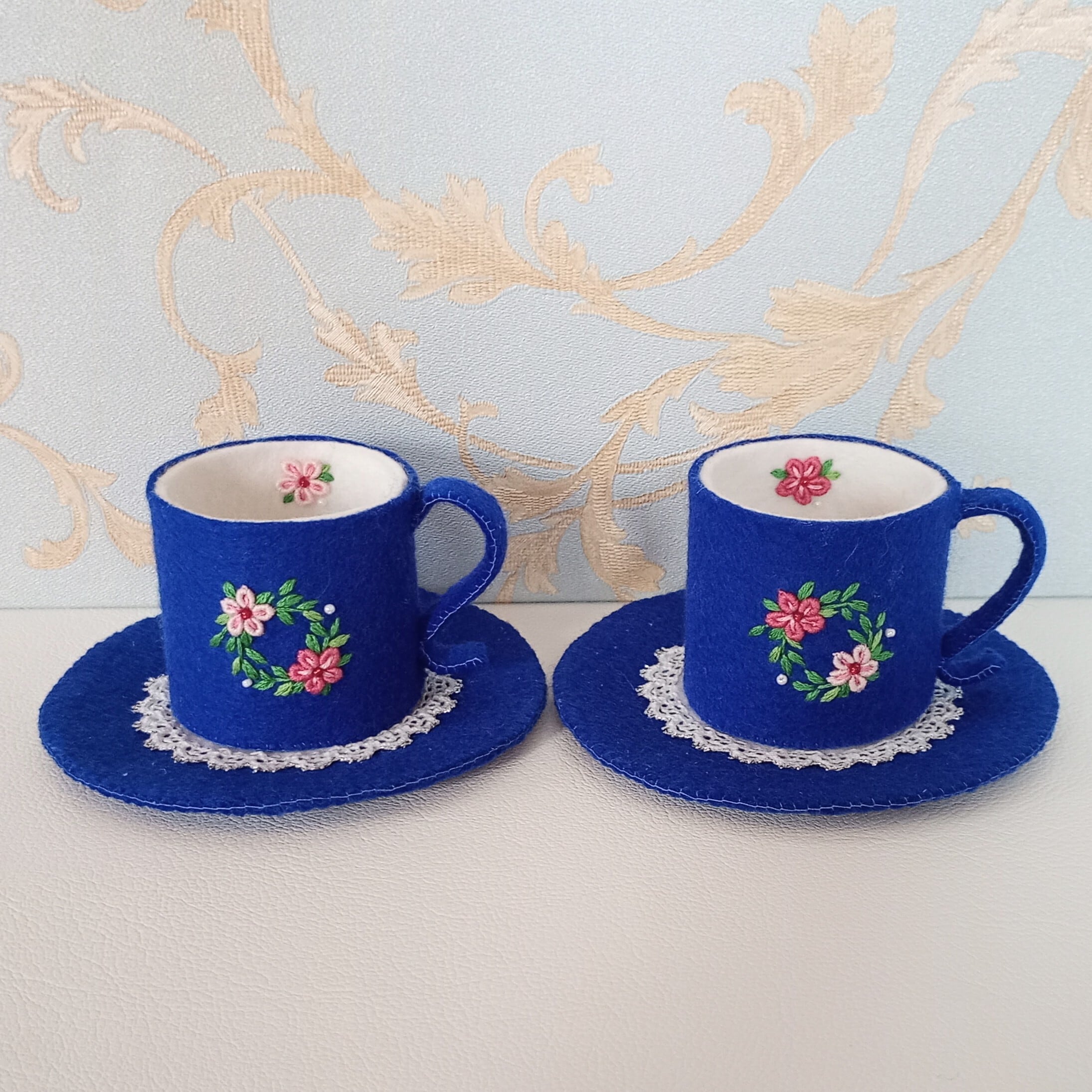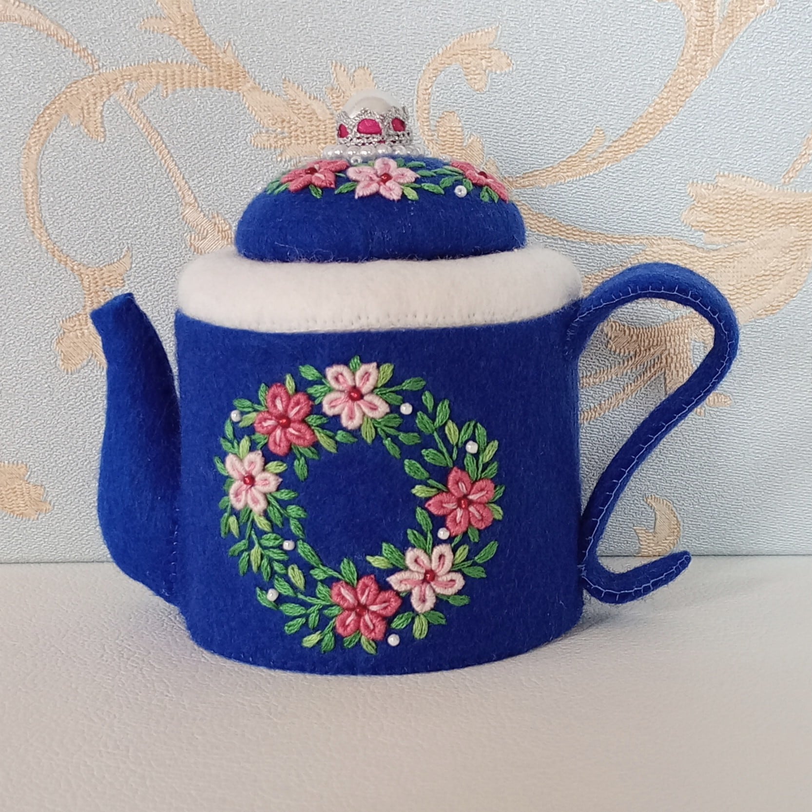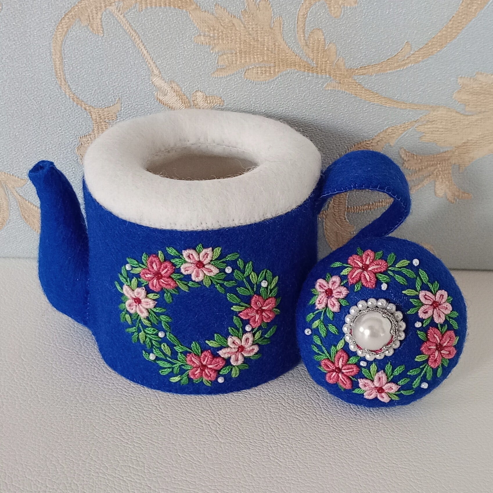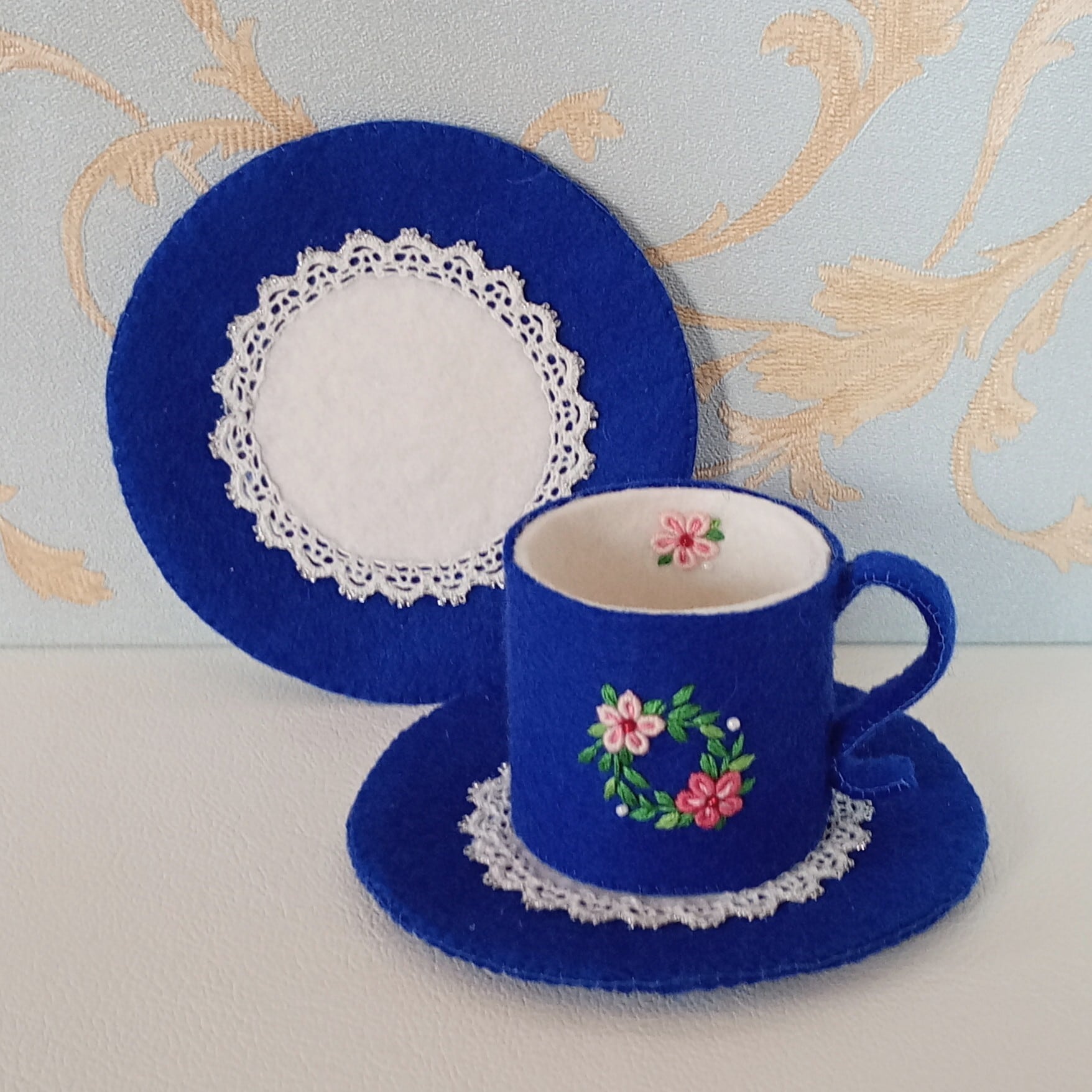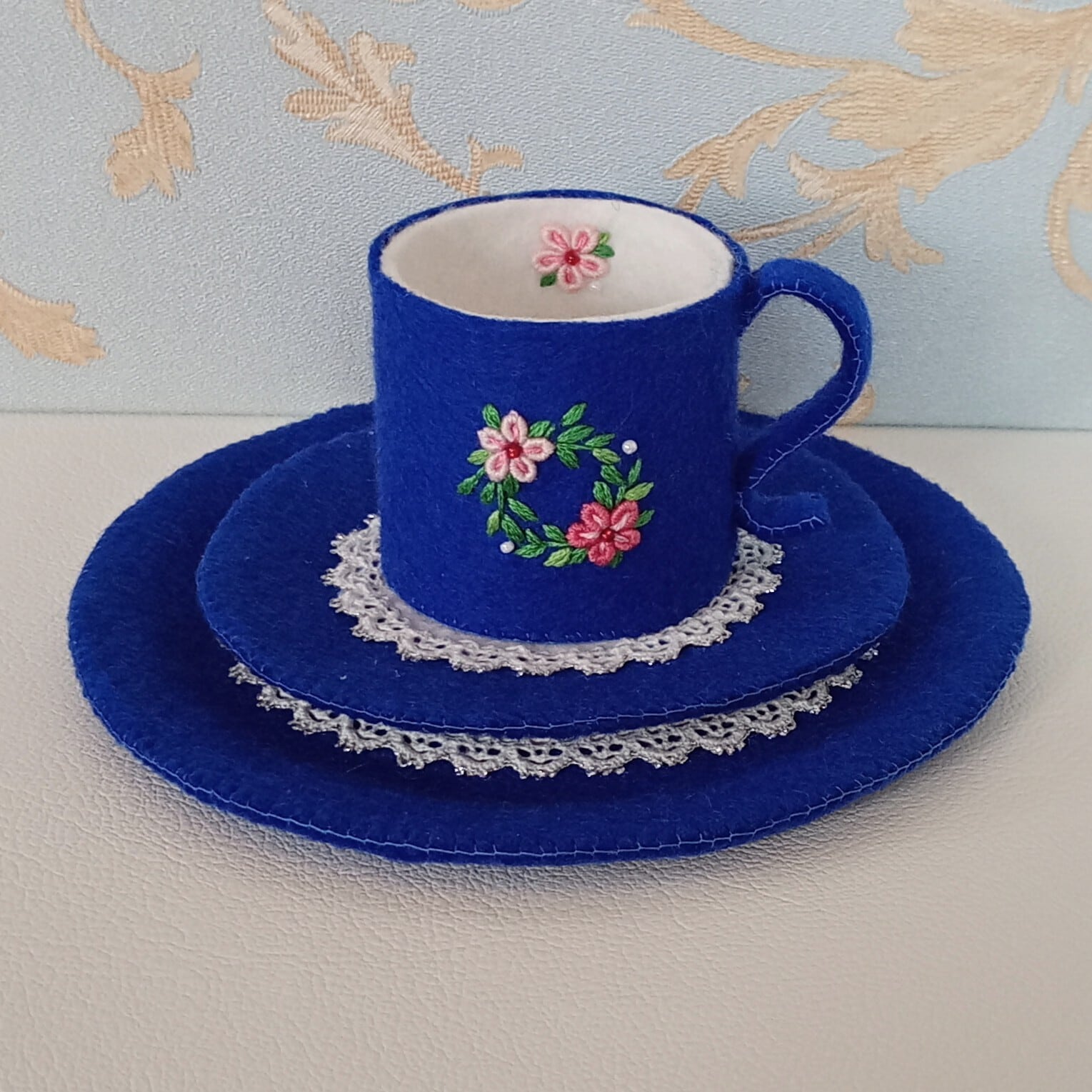 深みのある青いフェルトにピンクの花のリースを刺繍したおままごとのティーセットです。ティーセットが大人っぽい色味なので、ホールケーキと小菓子はピンクをメインに軽やかな雰囲気に仕上げました。甘いピンクよりも大人っぽい青が好き、というお子さまに是非手に取って頂きたいティーセットです。細かな刺繍と美味しそうなお菓子で素敵なティーパーティーはいかがですか?お子さまの遊びが楽しく盛り上がることはもちろん、大人から見ても華やかで楽しめる“絵になるおままごと”です。