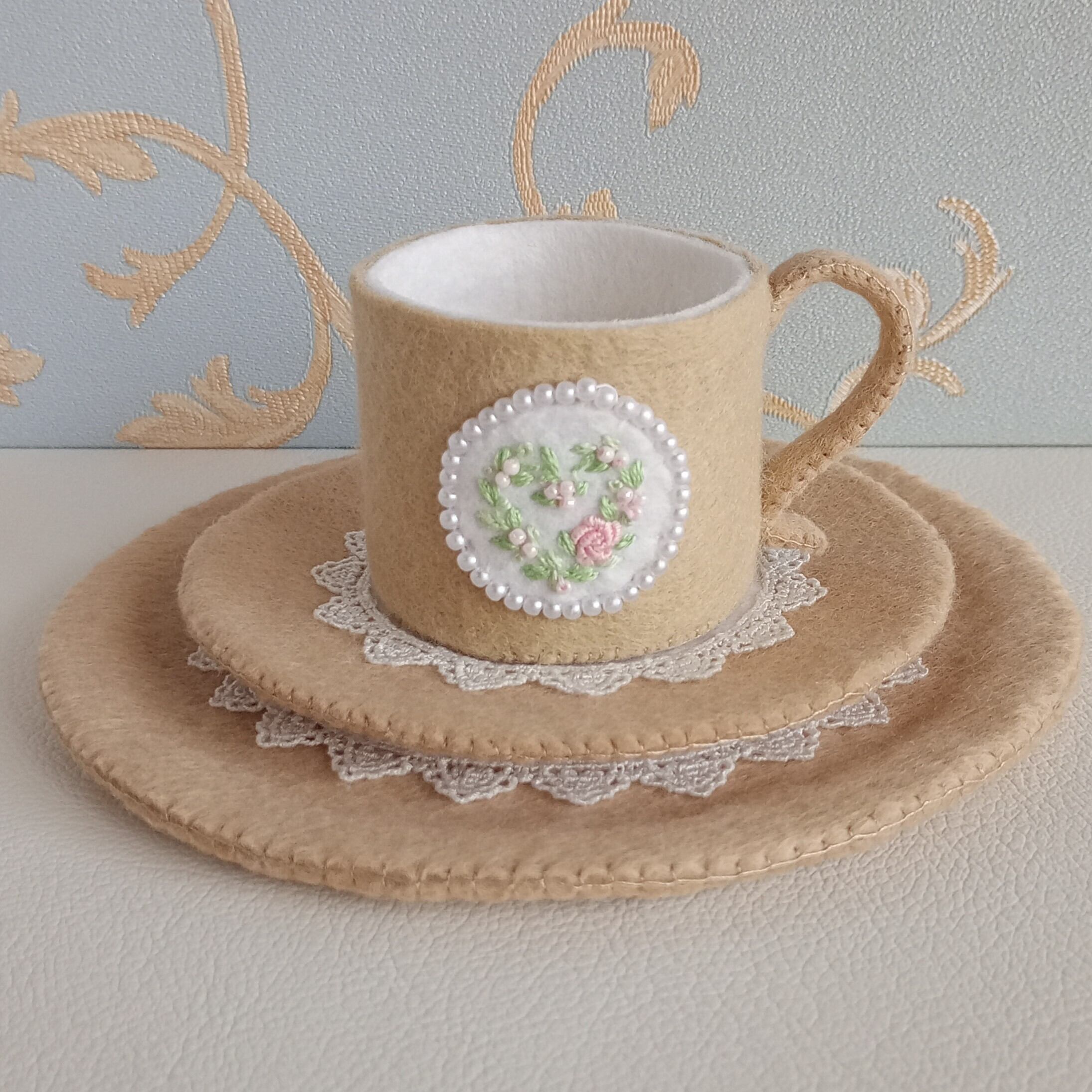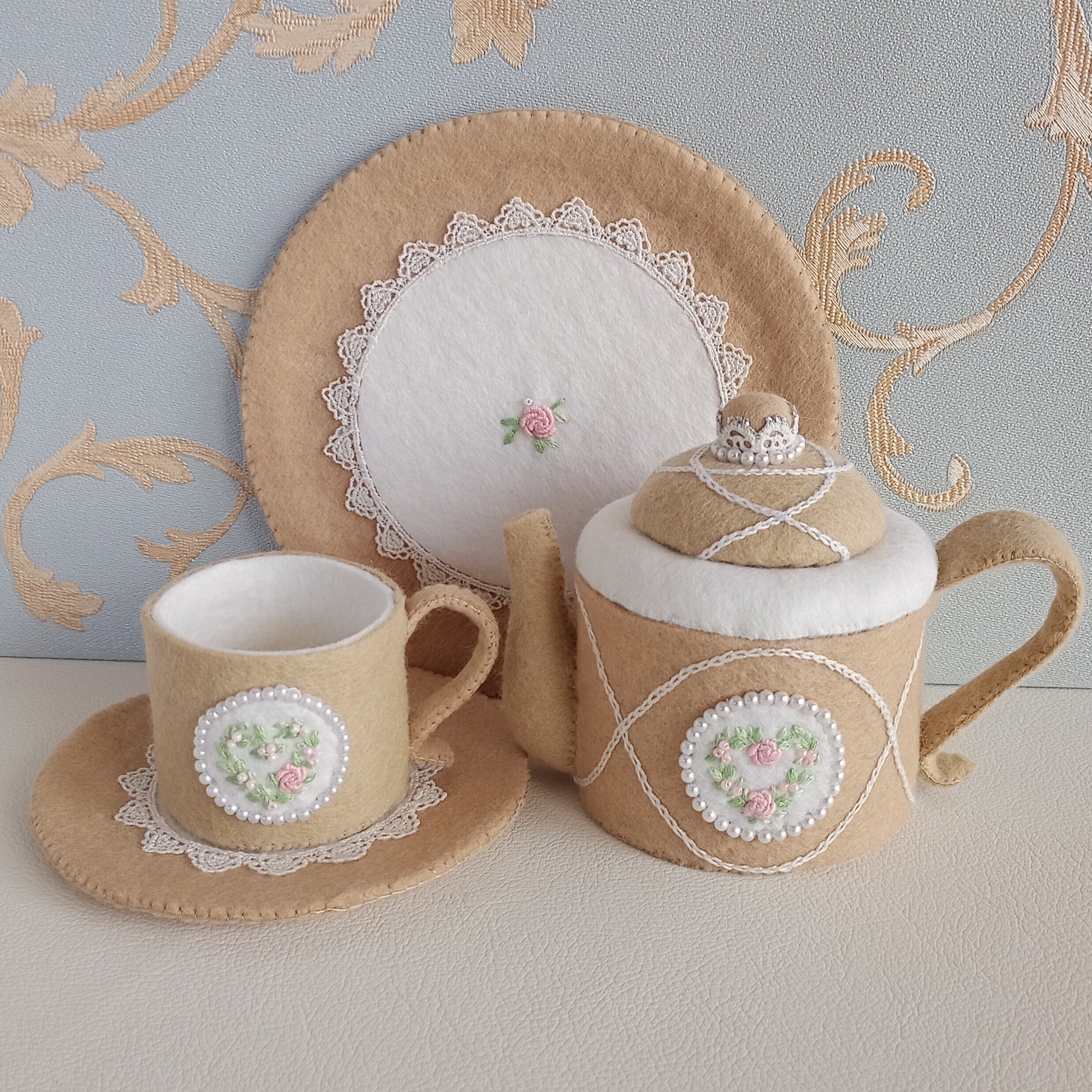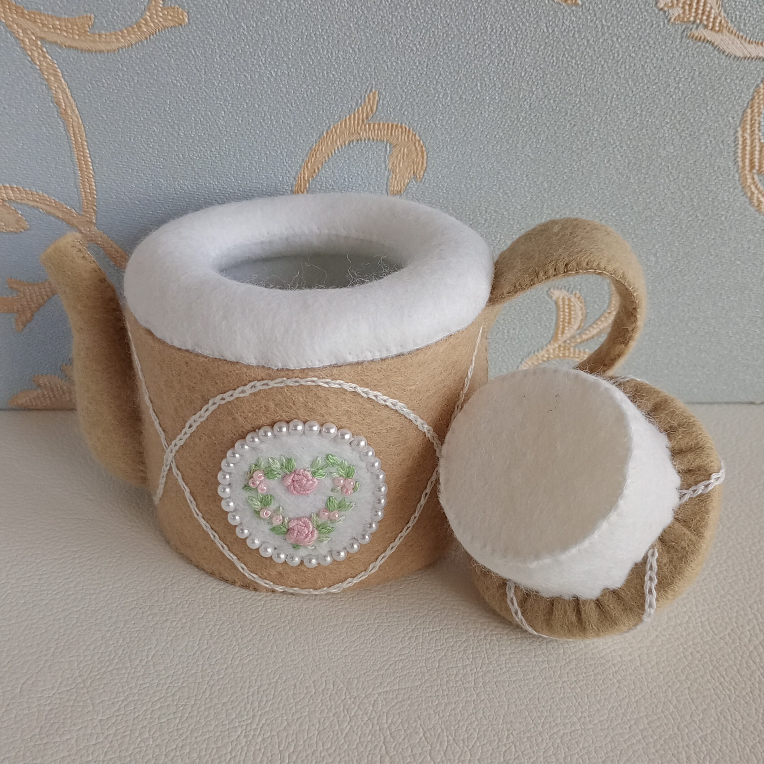 くすみカラーのベージュにピンクのバラのハートリースを刺繍したフェルトのティーセットです。おままごととしてお子さまが遊ぶのはもちろん、インテリアとしてもお楽しみ頂ける細部にこだわった仕上がりです。ベージュはお部屋のインテリアにも溶け込む色なので、日常空間で自然な可愛らしさを演出してくれる”絵になるおままごと”を是非お楽しみください。