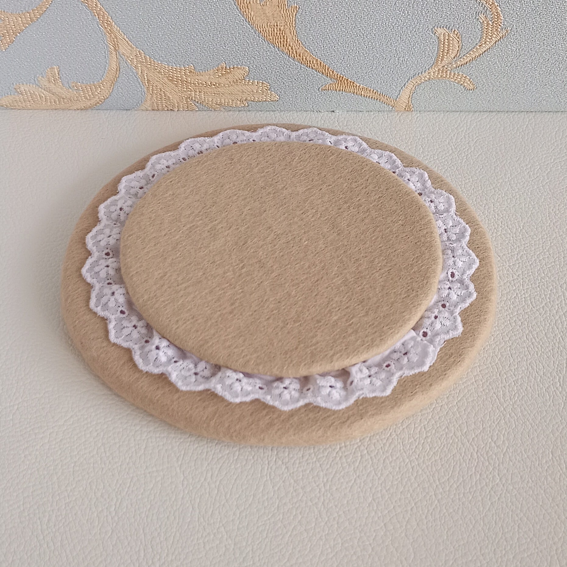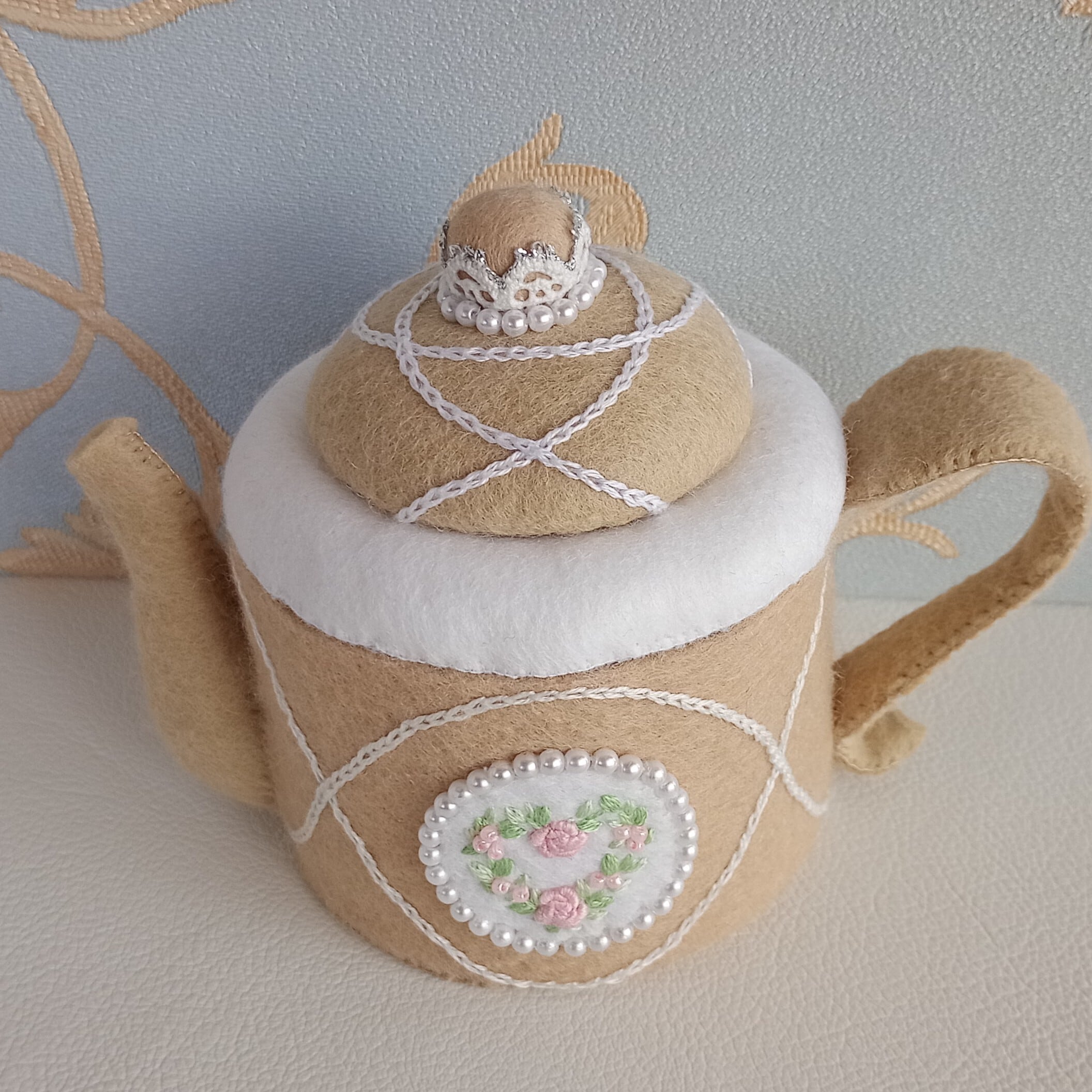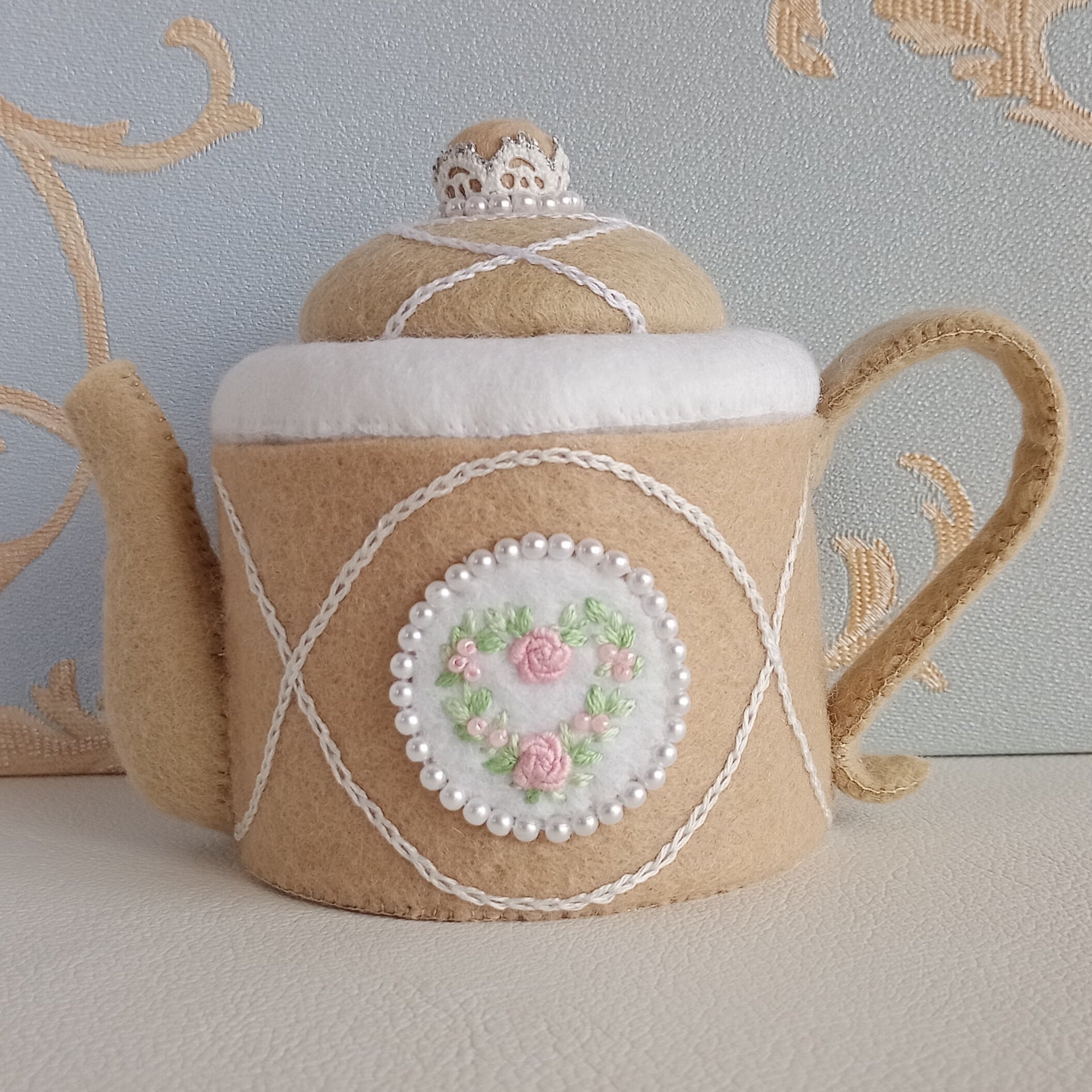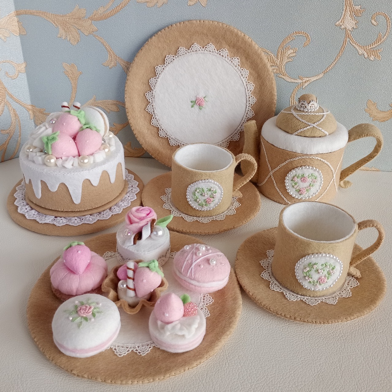 くすみカラーのベージュにピンクのバラのハートリースを刺繍したフェルトのティーセットです。おままごととしてお子さまが遊ぶのはもちろん、インテリアとしてもお楽しみ頂ける細部にこだわった仕上がりです。ベージュはお部屋のインテリアにも溶け込む色なので、日常空間で自然な可愛らしさを演出してくれる”絵になるおままごと”を是非お楽しみください。