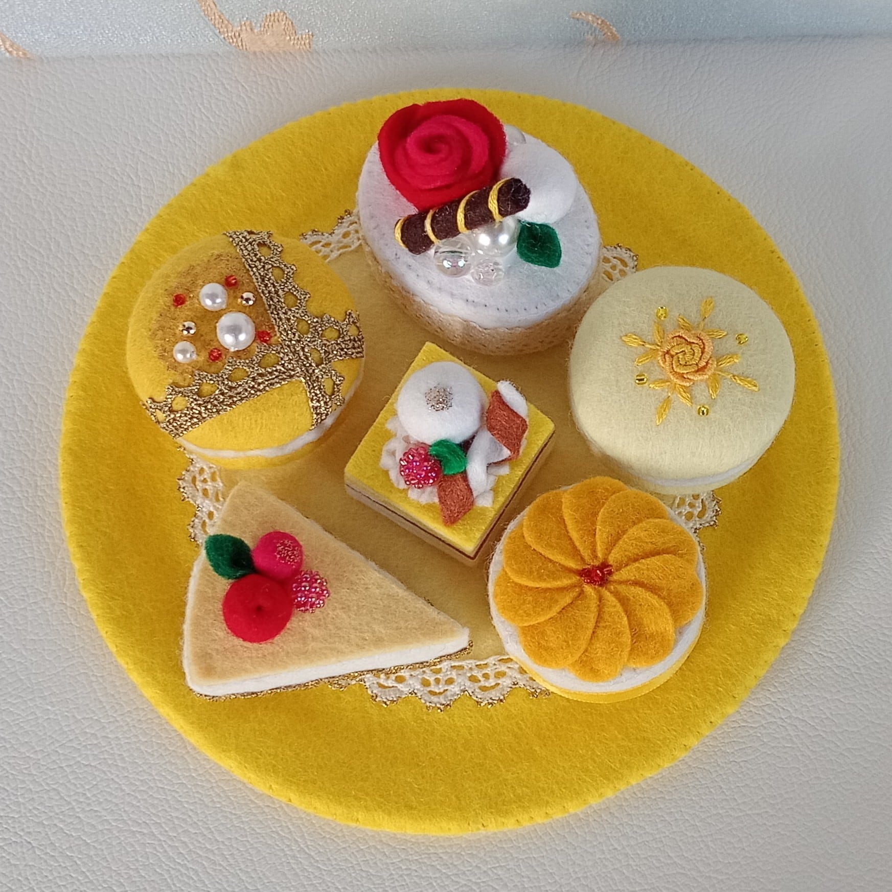 ・小菓子とホールケーキのラメは布用絵具を使用しています。デコレーションマカロンと花模様のケーキのビーズはぬいとめてあります。