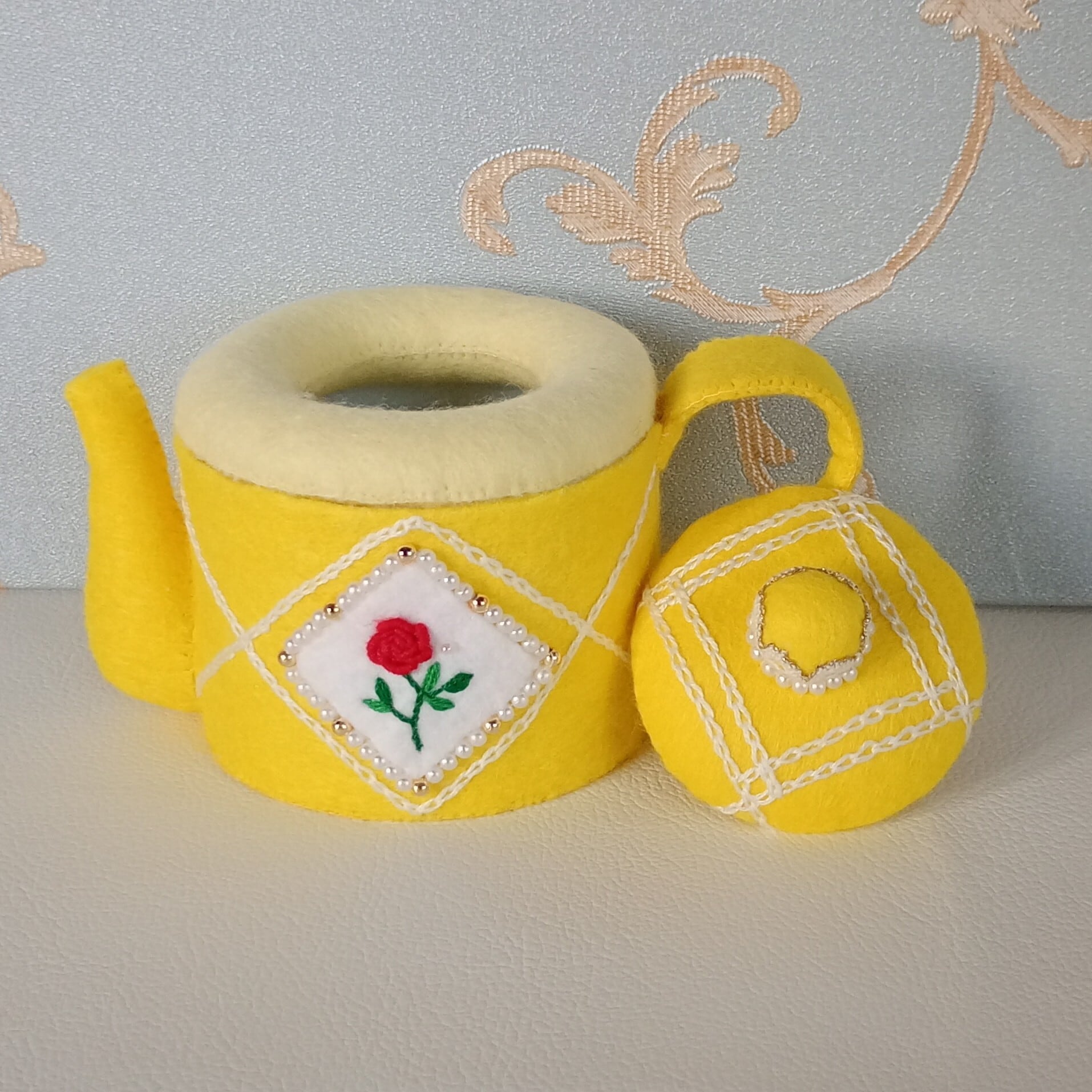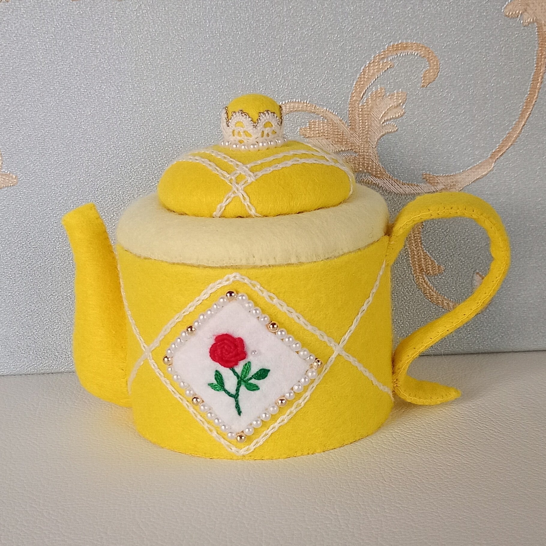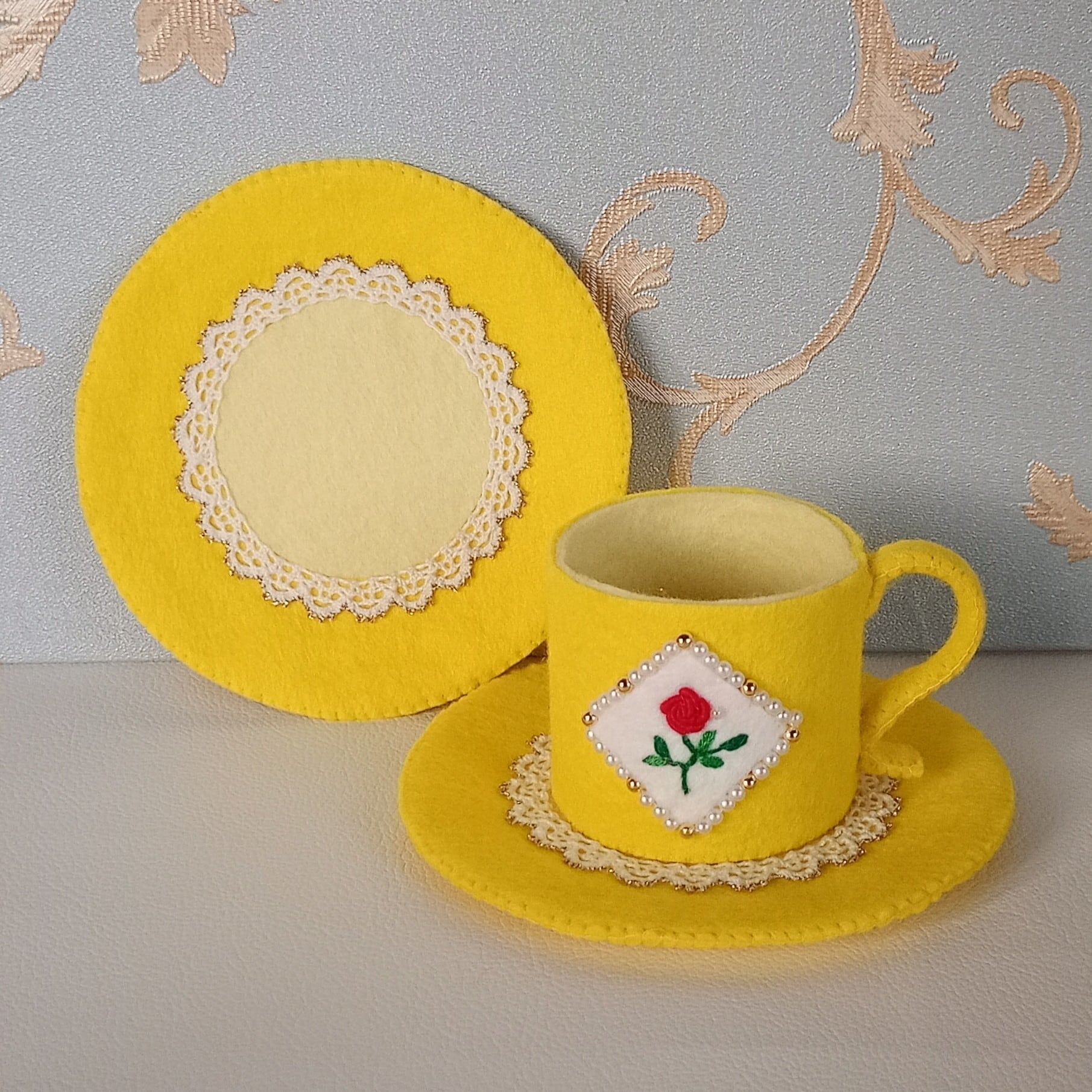 目が覚めるような発色のよい黄色のフェルトのティーセットです。赤い一本のバラを刺繍して、黄色いドレスを着たプリンセスの物語をイメージしました。また、見ているだけで元気が出そうな華やかな黄色ですので、インテリアとしてお部屋に飾っても運気が上がりそうです。