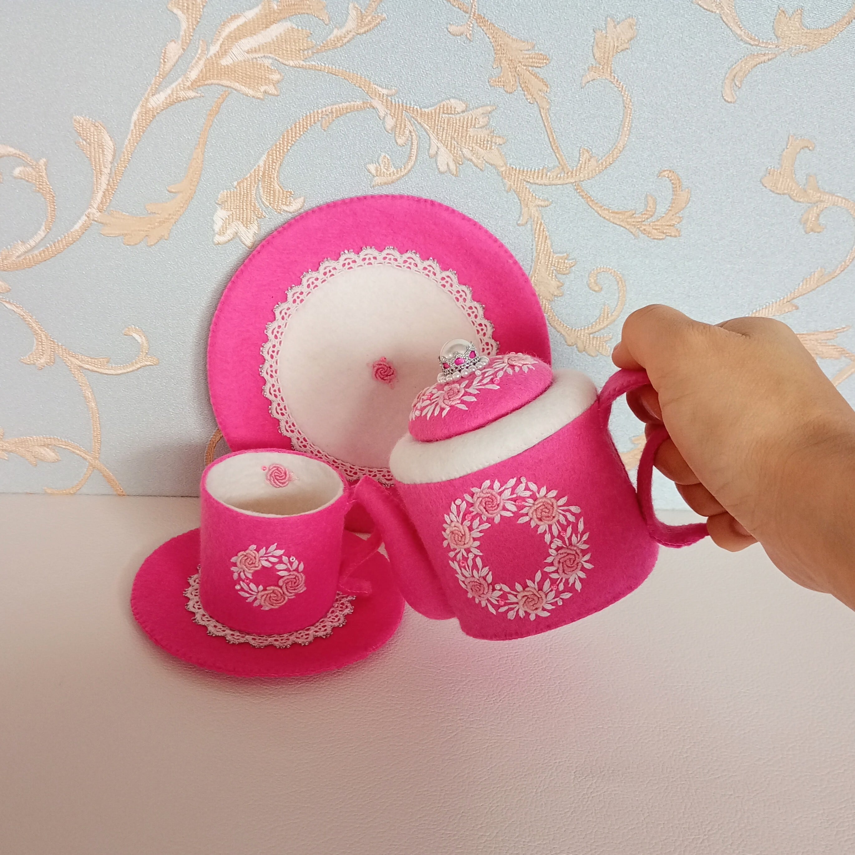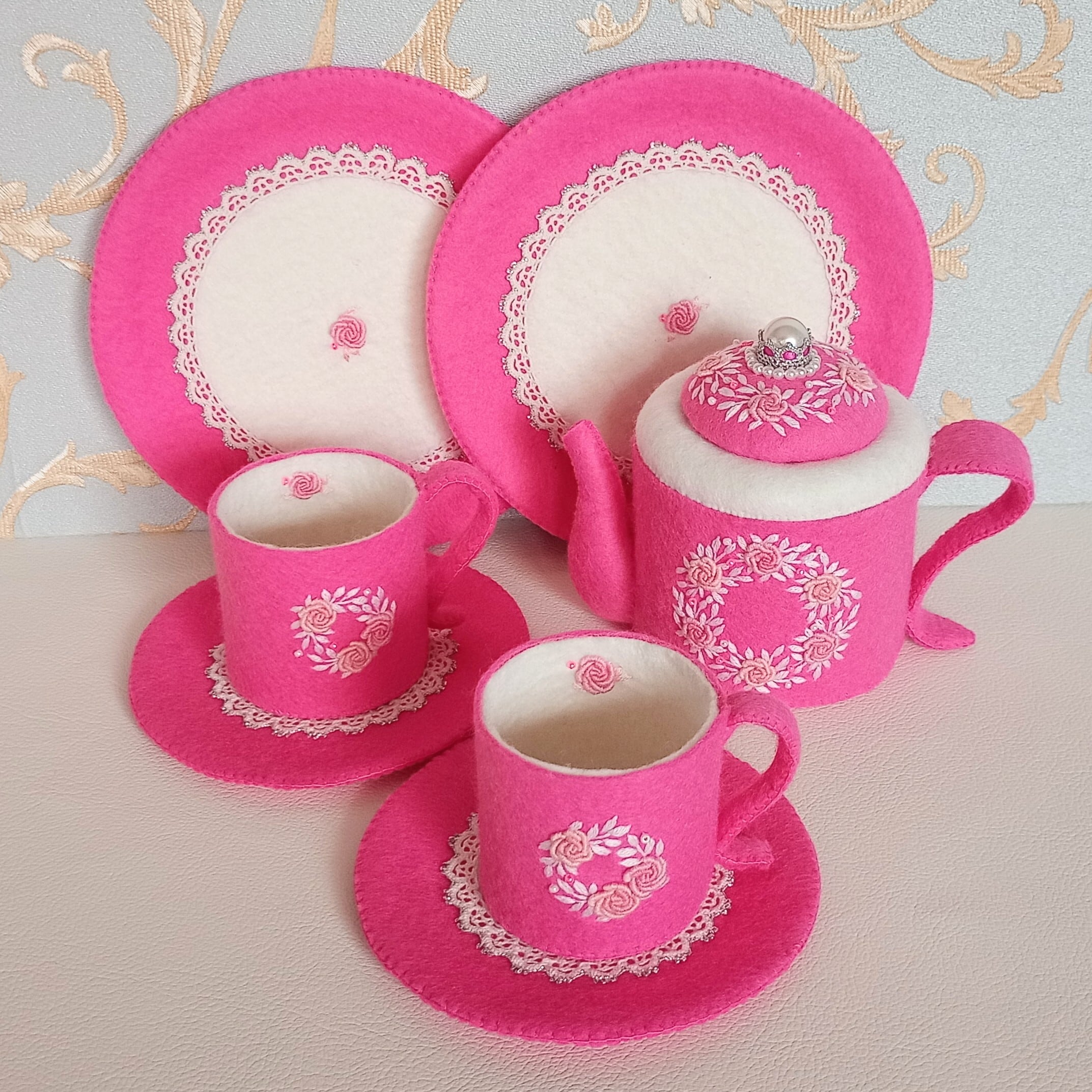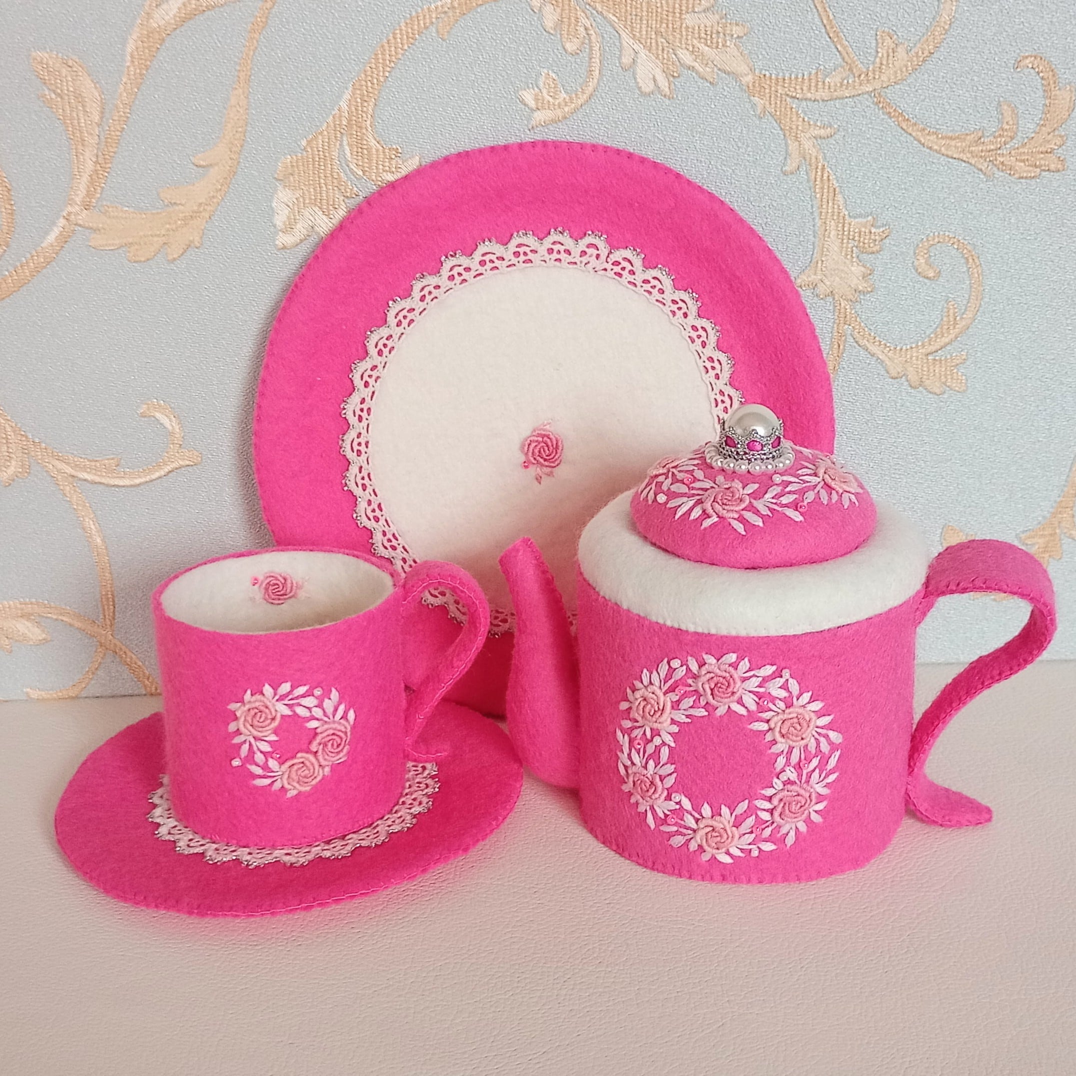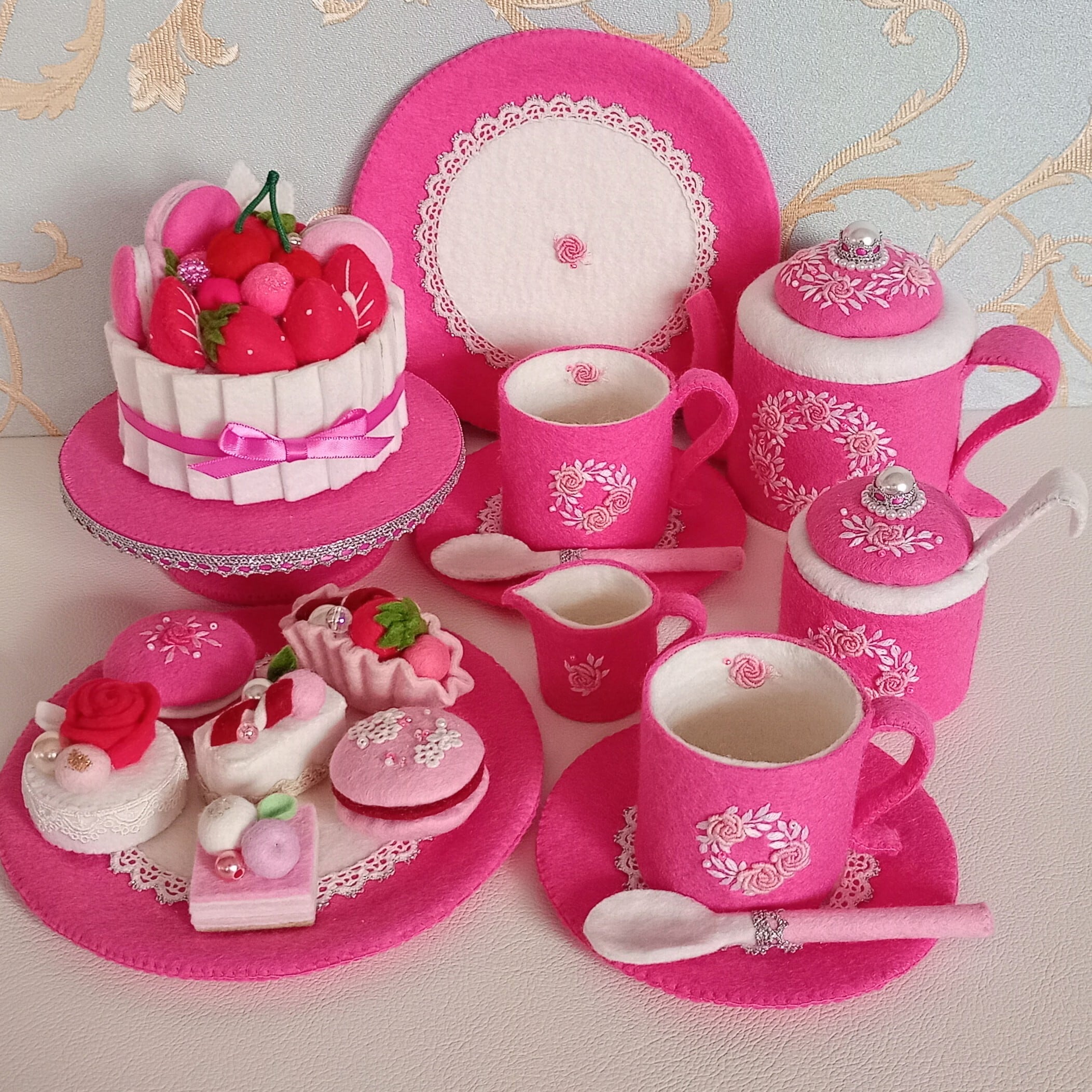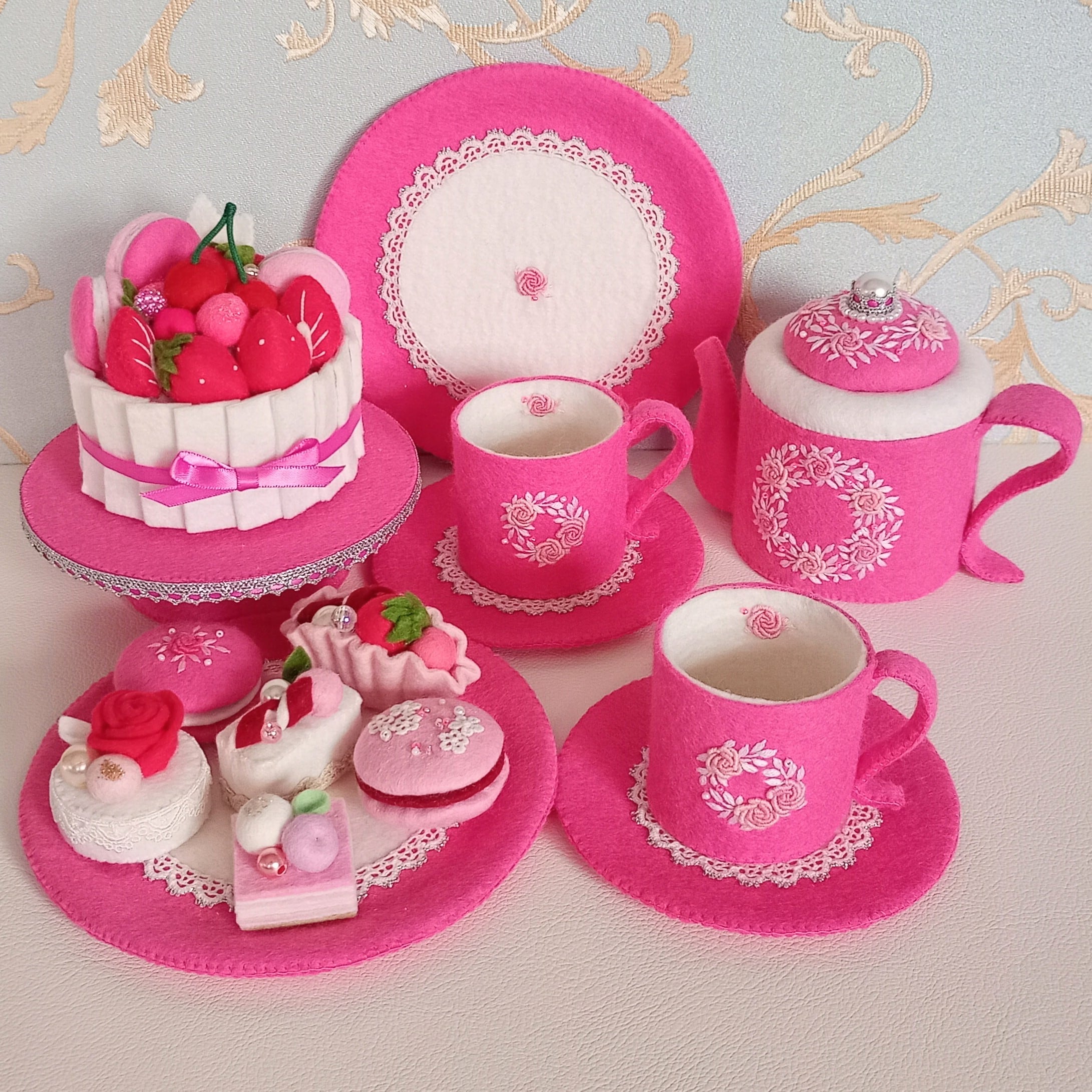 発色のよいピンクのフェルトに薄ピンクのバラと白い葉のリースを刺繍したおままごとのティーセットです。ケーキも小菓子もピンクづくしにしました。ピンク好きにはたまらない華やかなティーセットで、素敵なティーパーティーはいかがですか?お子さまの遊びが楽しく盛り上がることはもちろん、大人から見ても華やかで楽しめる“絵になるおままごと”です。