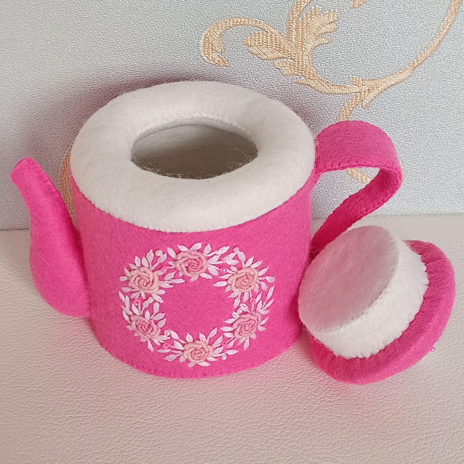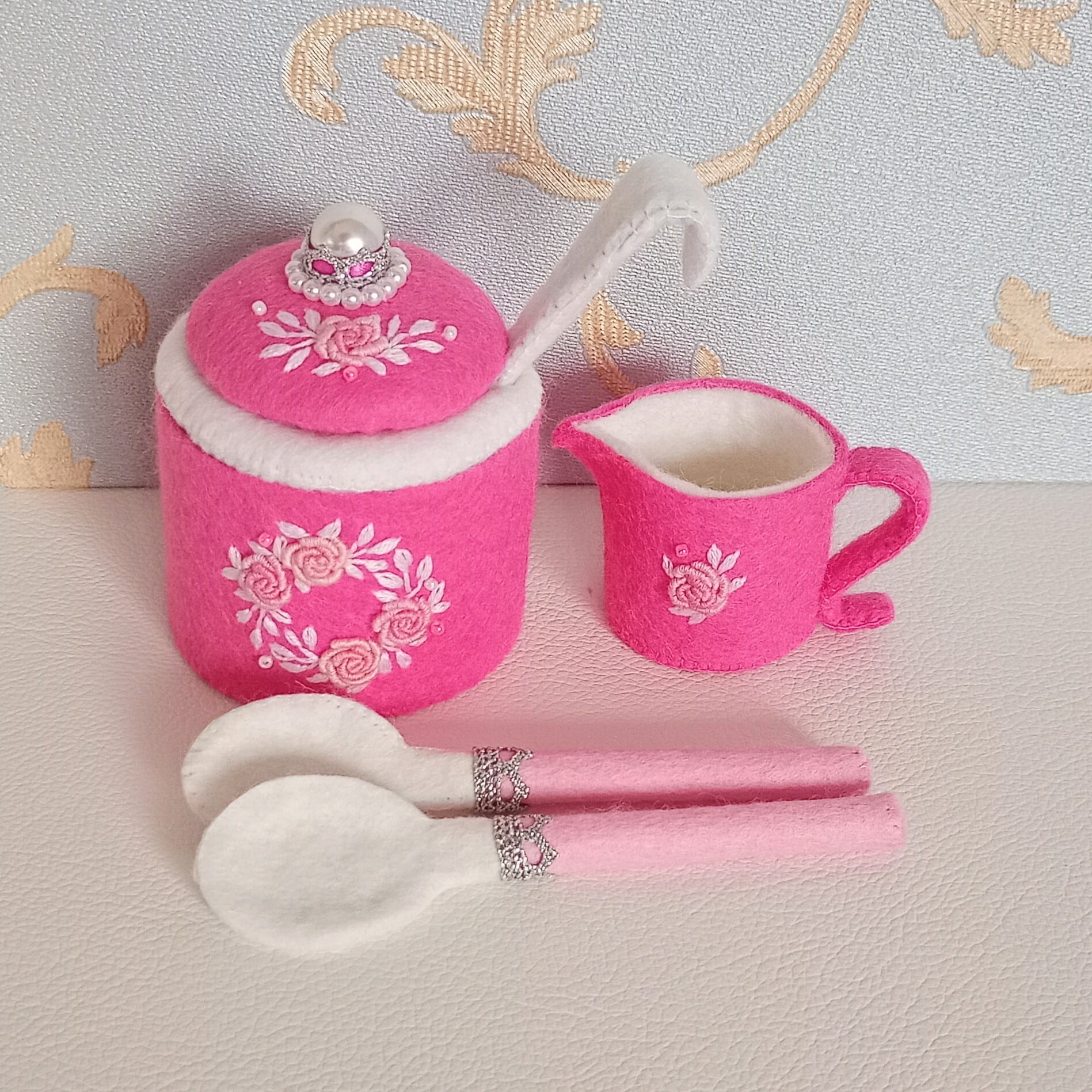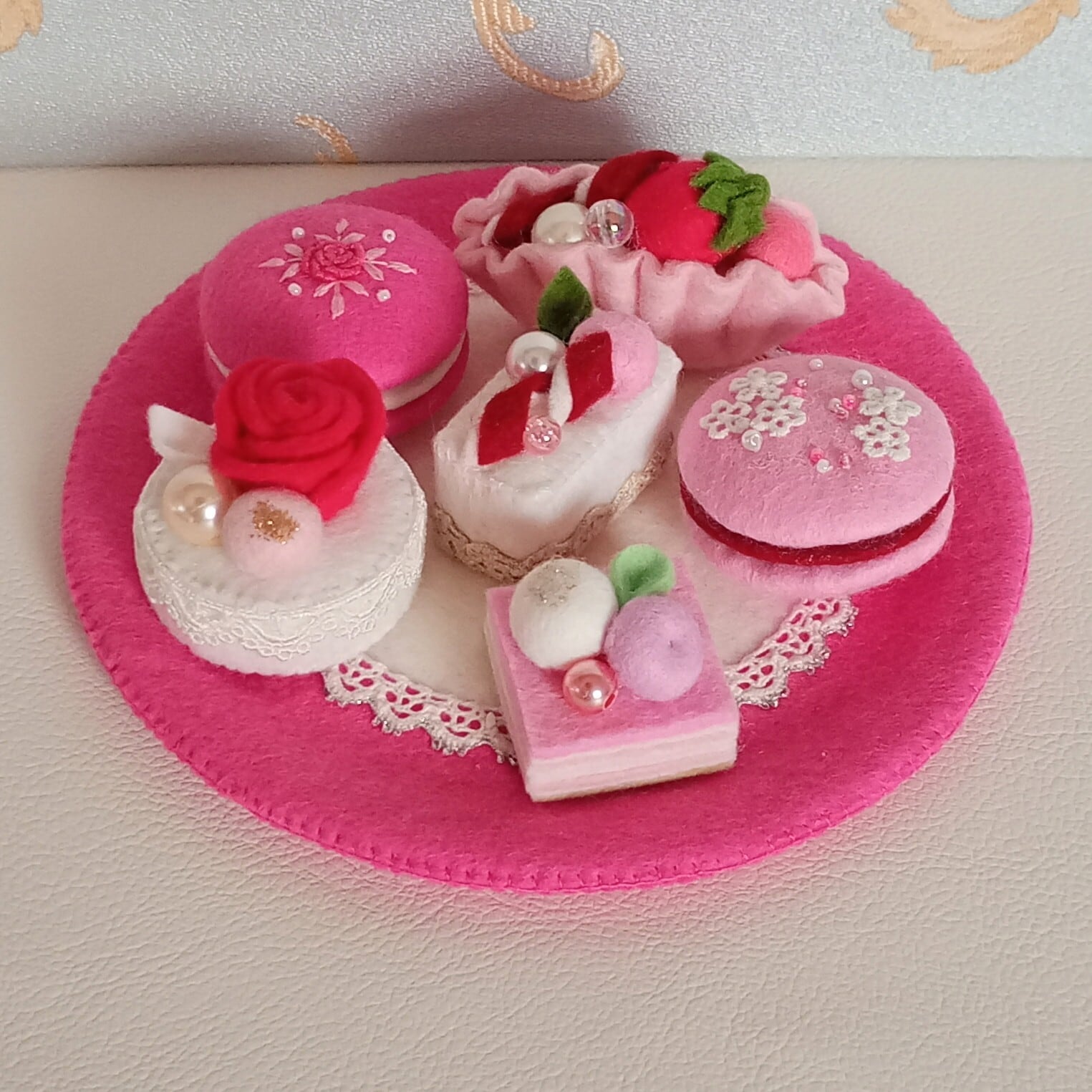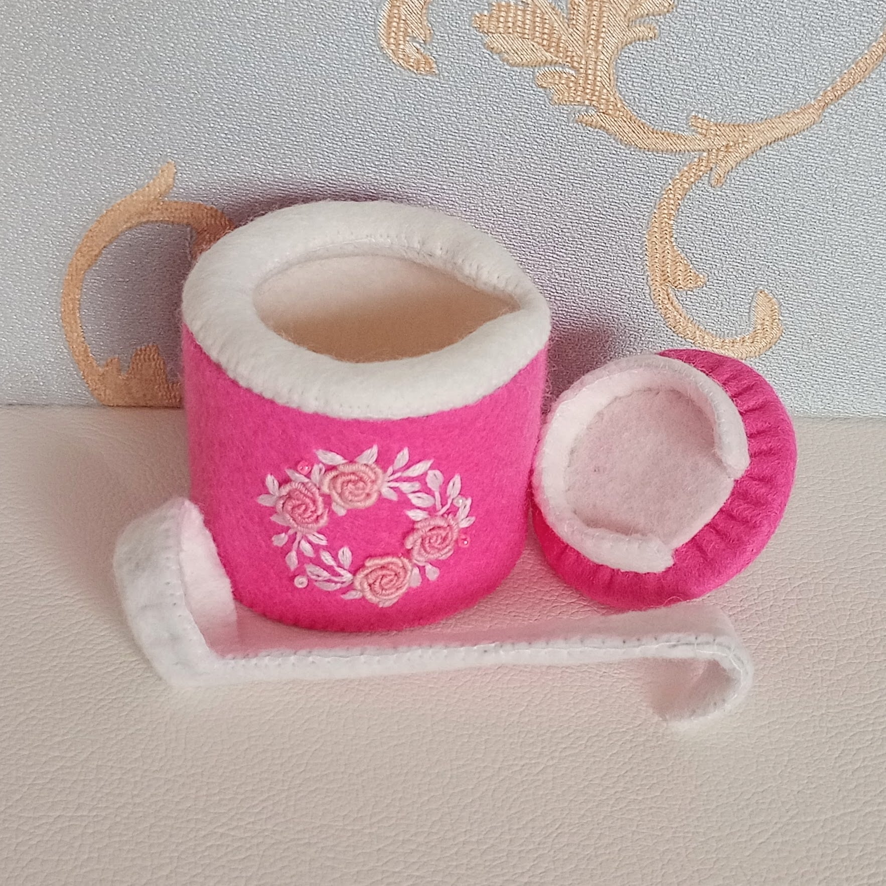 発色のよいピンクのフェルトに薄ピンクのバラと白い葉のリースを刺繍したおままごとのティーセットです。ケーキも小菓子もピンクづくしにしました。ピンク好きにはたまらない華やかなティーセットで、素敵なティーパーティーはいかがですか?お子さまの遊びが楽しく盛り上がることはもちろん、大人から見ても華やかで楽しめる“絵になるおままごと”です。
