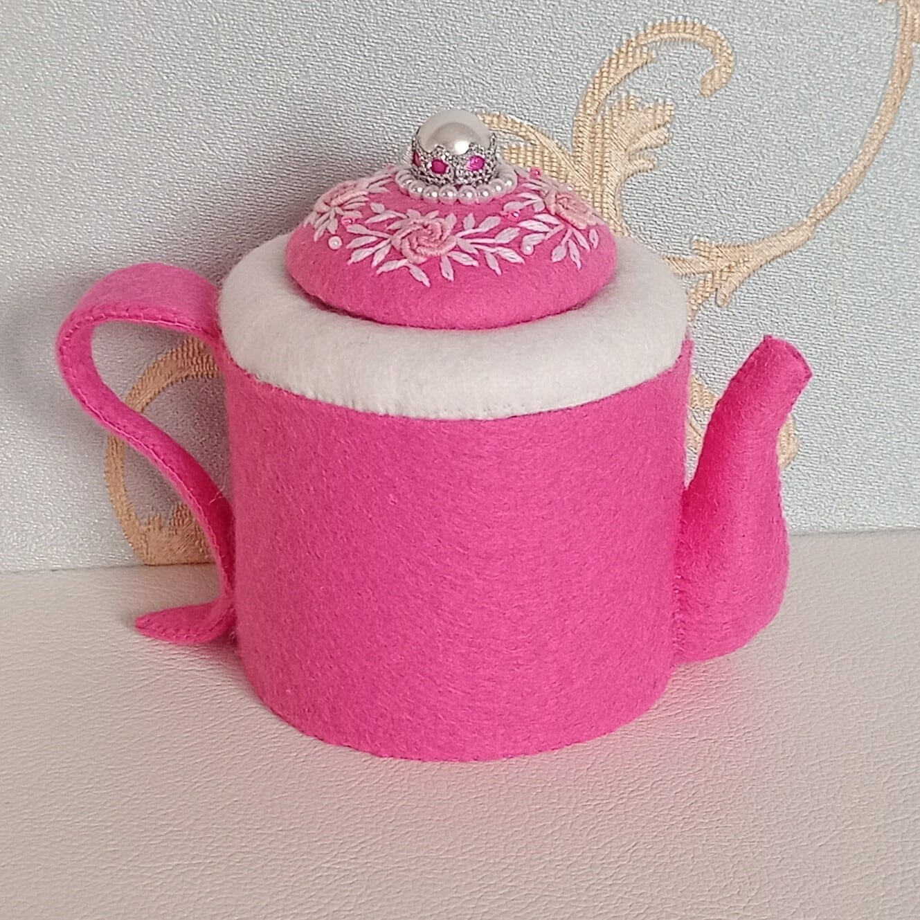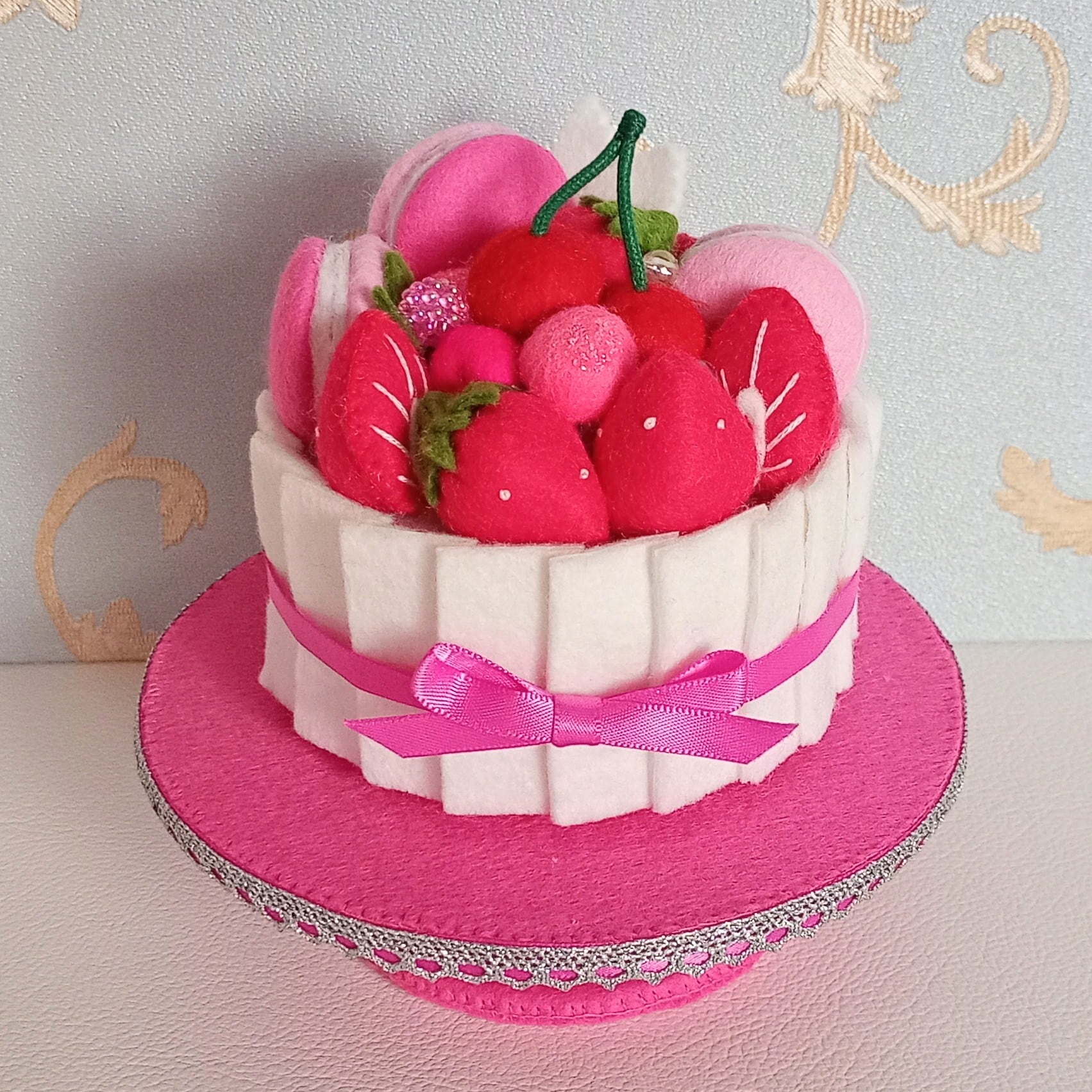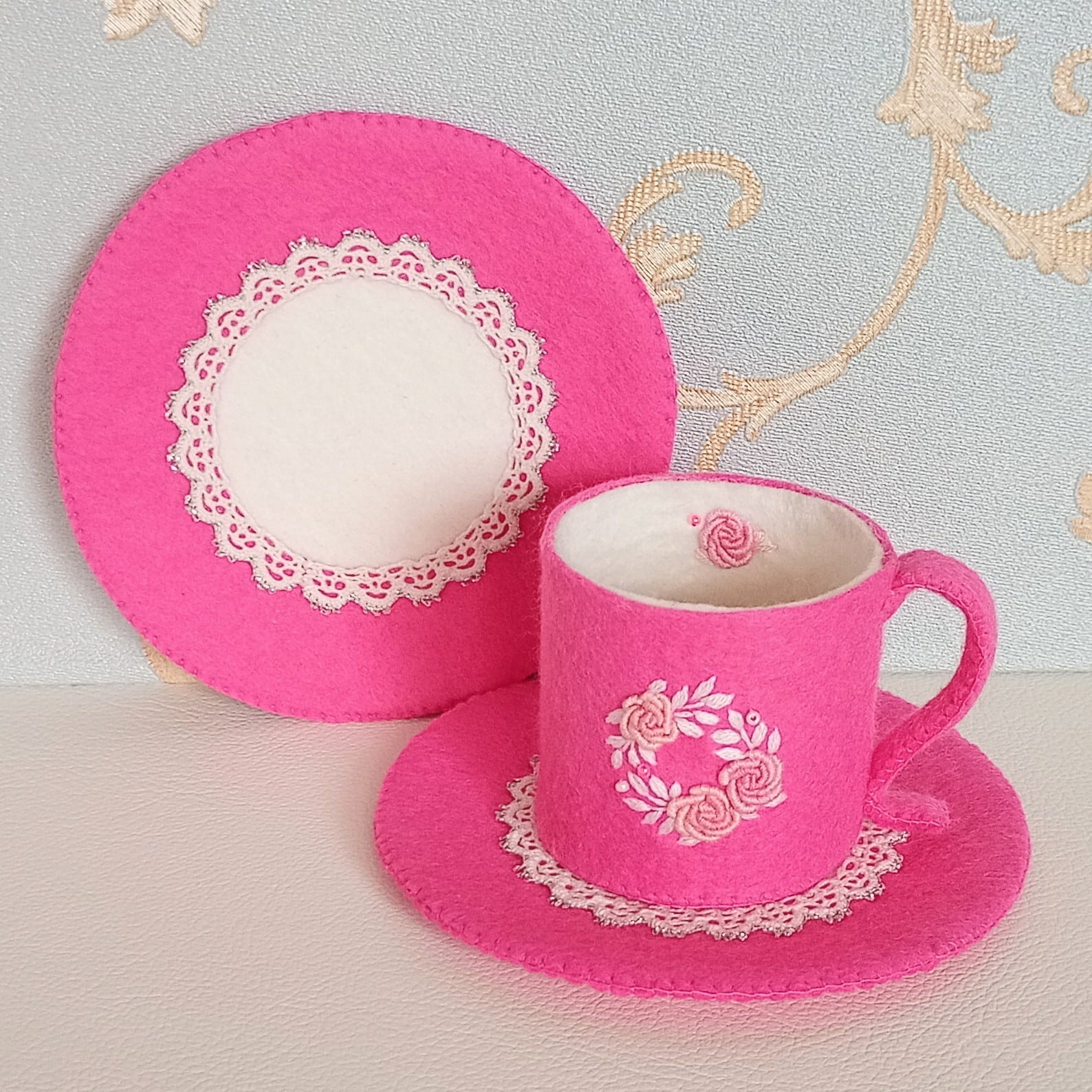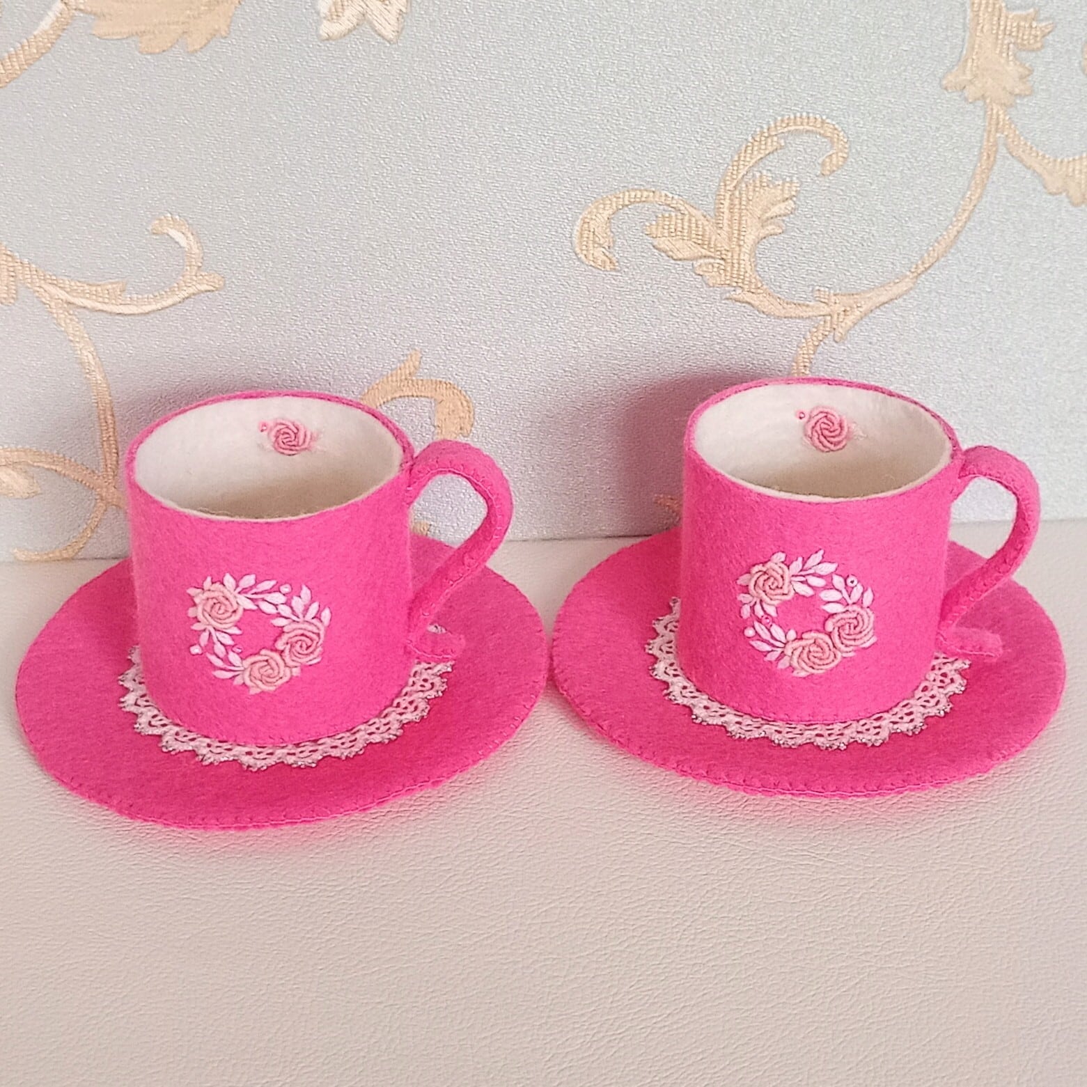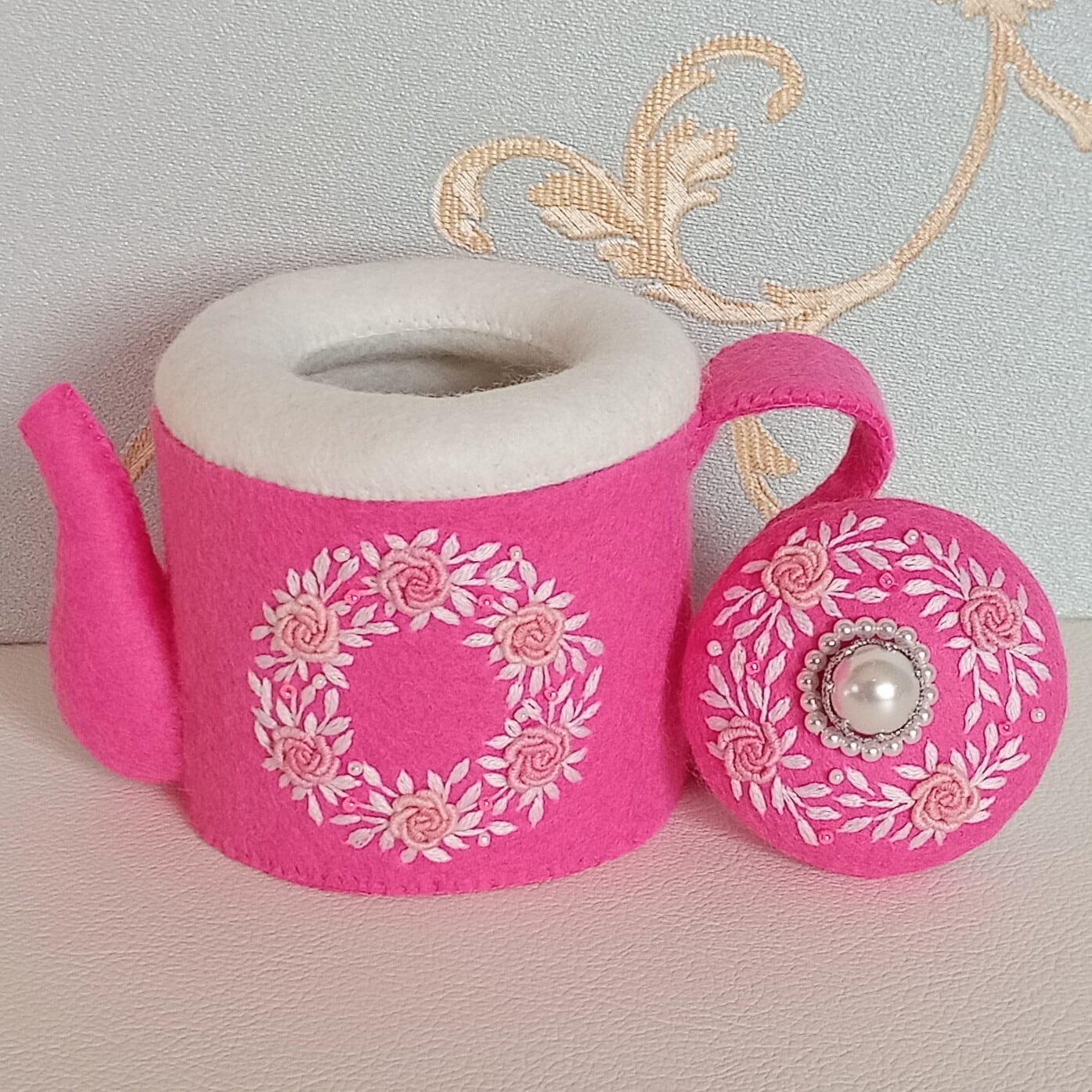 発色のよいピンクのフェルトに薄ピンクのバラと白い葉のリースを刺繍したおままごとのティーセットです。ケーキも小菓子もピンクづくしにしました。ピンク好きにはたまらない華やかなティーセットで、素敵なティーパーティーはいかがですか?お子さまの遊びが楽しく盛り上がることはもちろん、大人から見ても華やかで楽しめる“絵になるおままごと”です。